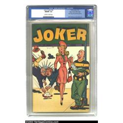 Joker Comics #23 Mile High pedigree (Timely, 1946) CGC NM/MT 9.8 Off-white to white pages. Jaw-dropping copies are expected with this famed pedigree, but this book is exceptional even for a Mile High. It's the only unrestored, non-Qualified copy of the issue CGC has certified to date. The issue is significant for featuring the first "Hey Look" by Harvey Kurtzman, and for displaying the artwork of the weird genius Basil Wolverton. With its cover brightness, prickly corners, immaculate spine, and superior page quality, condition-wise, this one nears perfection. Overstreet 2003 NM 9.4 value = $310. Important notice: Heritage usually auctions material at the rate of 200-250 lots per hour. On some occasions eBay Live bid software or the Internet may not be able to keep up with the pace of the auction. We recommend placing a realistic absentee bid now as insurance to avoid disappointment. Occasionally the auctioneer may eliminate or reject an eBay Live bid, and the auctioneer may also reopen a lot after the close of the eBay live bidding (usually because we missed an audience bid), and may reject your bid even if it shows you as the winning bidder. By bidding via eBay Live, you agree that Heritage may award the lot to another bidder at its sole discretion under the circumstances described above or any other reasonable circumstances. Also please note that all Heritage lots purchased through eBay Live carry a 20% Buyer's Premium. Please make sure you read the Terms and Conditions before you bid.