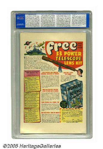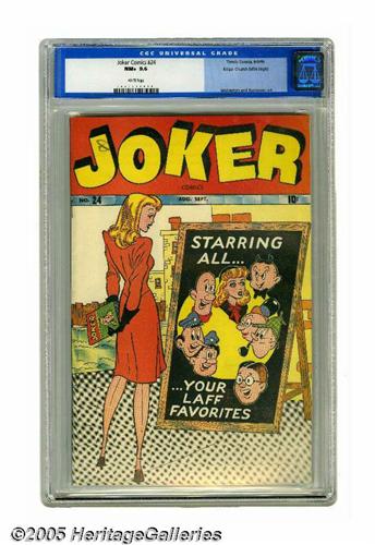 <B>Joker Comics #24 Mile High pedigree (Timely, 1946) CGC NM+ 9.6 White pages.</B></I> Basil Wolverton's Powerhouse Pepper and Harvey Kurtzman's "Hey Look" feature are among the funny stuff here. This is the only copy of this issue that CGC has certified as of this writing. Overstreet 2005 NM- 9.2 value = $360. CGC census 5/05: 1 in 9.6, none higher.