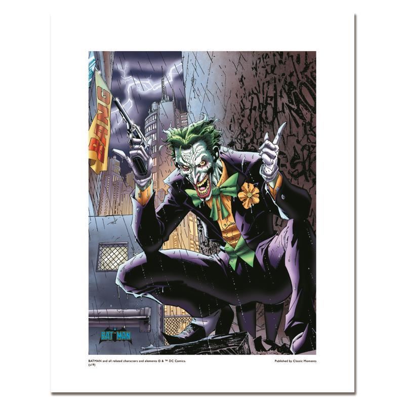 "Joker" is a limited edition giclee on paper licensed by DC Comics. Based on art done by Jim Lee for the 2003 comic "Hush" this piece is numbered and includes Certificate of Authenticity. Measures approx. 20" x 16" (with border) 16" x 12" (image).