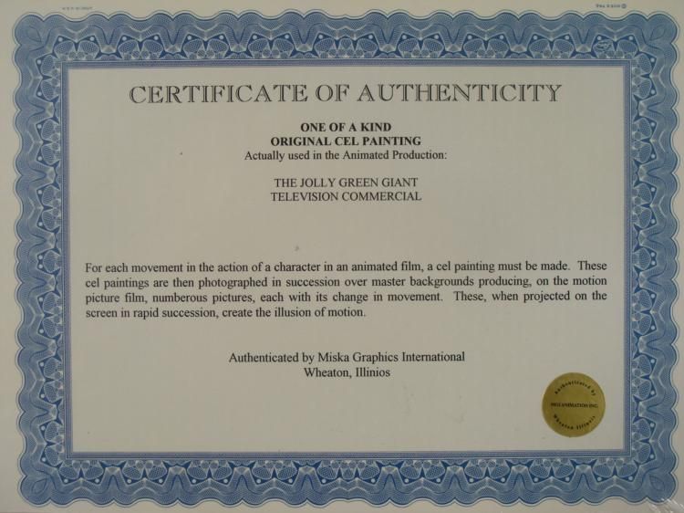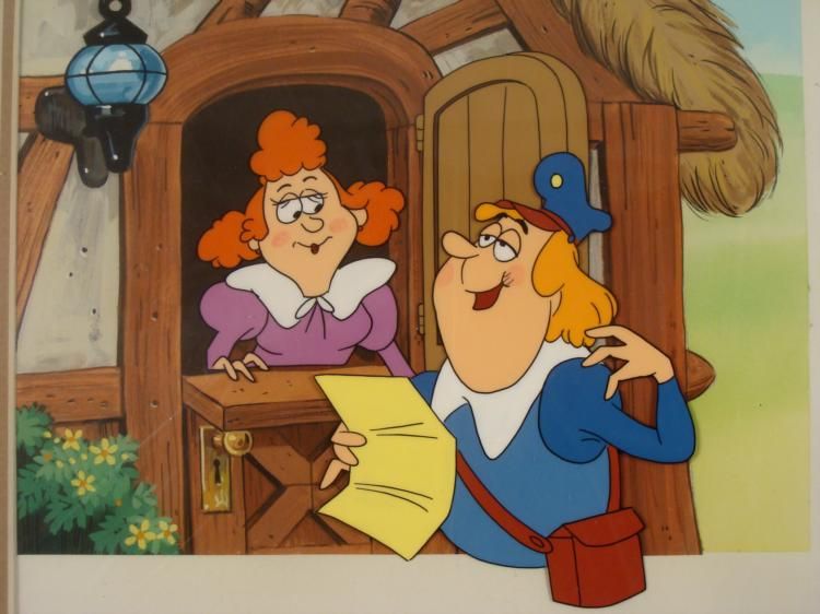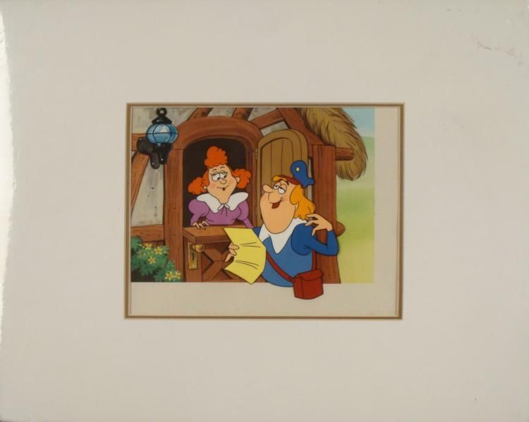 Here is an original animation cel used in the production of a Jolly Green Giant television commercial. This scene features a postman reading a letter to a lady living in a thatch roofed cottage. This was, after all, down in the land of the Jolly Green Giant! Medium: Hand-inked and hand-painted acetate cel, with hand drawn and painted backgroundImage size: 10 x 7 3/4 inchesPresentation: Double matted in brown and whiteMatte size: 20 x 16 inchesCondition: Excellent; sealed in cellophaneCertificate of Authenticity: Included