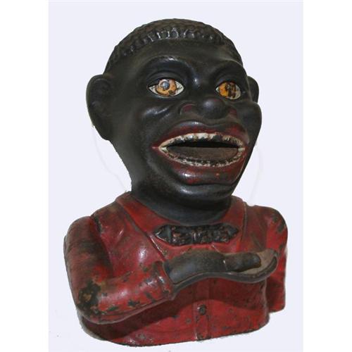 Cast Iron mechanical bank in form of black bust is approximately 5" wide at base and stands 6 ½" tall.  Place a coin in figure’s hand, press lever behind left arm to raise coin to mouth, figure rolls eyes upward as coin is deposited in mouth.  On back of bank in raised letters: Jolly –---- Bank, Pat. Mar. 14, ‘82.   On base of bank is: Manufactured by The J&E Stevens Co. Cromwell, Conn. USA.  The coin box cover is missing.  Even though paint is worn, bank has attractive patina.