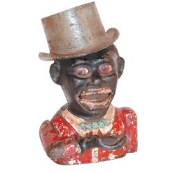 Jolly "N" cast iron mechanical bank w/top hat, has most of it's original red, cream & blue paint, round holes in back of head & base, 7"H.
