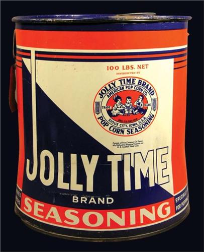 Jolly Time Brand Popcorn Seasoning 100 lb Tin. Flared bottom, excellent original condition. 17 1/2 inch diameter X 18 inches tall.