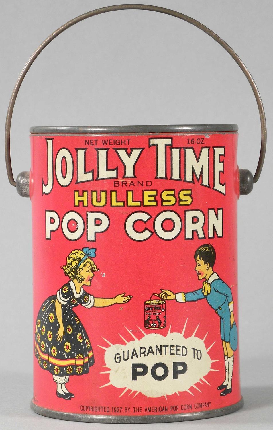Jolly Time Hulless Pop Corn 16 oz Tin w/bale. Tin litho graphics. American Pop Corn Company, Sioux City, Iowa. USA. No lid and tiny scratch on front otherwise excellent condition. 3 1/4 inch diameter X 4 inches tall. Start Price $30