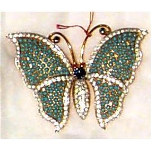 Turquoise stones with Rhinestones outlining wings, rhinestone body, blue stone head, red stone eyes, green stones in end of Antenna