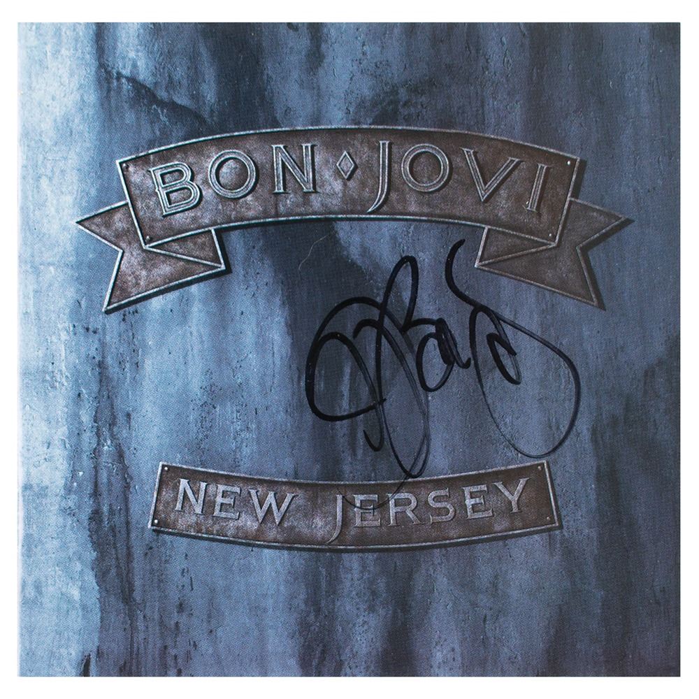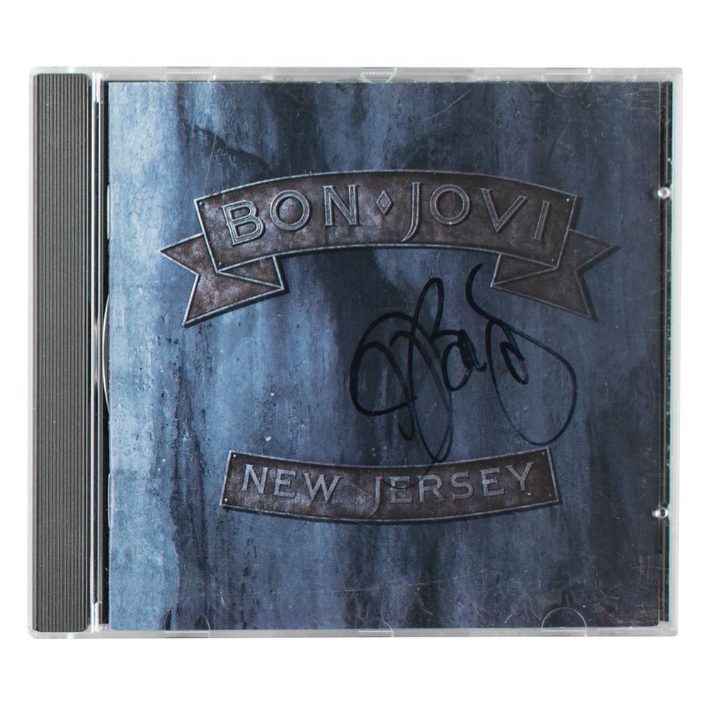 New Jersey CD by Bon Jovi, signed on the front cover in black felt tip by Jon Bon Jovi. In fine condition. The CD is included. Accompanied by an unused backstage 'crew' pass for a Bon Jovi concert at the Hartford Civic Center in Hartford, Connecticut, on February 18, 1993.