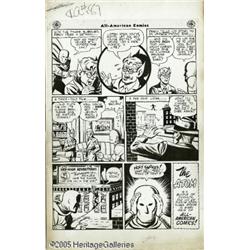 <B>Jon Chester Kozlak - All-American Comics, Atom Story page 6 Original Art (DC, 1940s).</B></I> Poor Percy has freaky-big pointed ears, which apparently makes him the subject of discrimination -- but that's no excuse for turning to crime, and when Percy lifts some priceless jewels, the diminutive Atom steps in to put the situation right. This vintage gem is a prime example of the kind of bold, simple storytelling that reigned supreme in the Golden Age. And, as an added bonus, it's the last page of the story, and features a terrific head-shot of the Mighty Mite in the last panel. We're not sure exactly which issue this appeared in (the last Atom story in <B>All-American</B></I> was in issue #72, so the #87 might indicate that it is unpublished), but is probably from late in the run. The artwork measures 14.5" x 22.5" and is in Excellent condition with some creasing in the top right corner, and overall aging. It's a major bit of Golden Age cool, so don't delay your frantic bidding on this classic superhero page.
