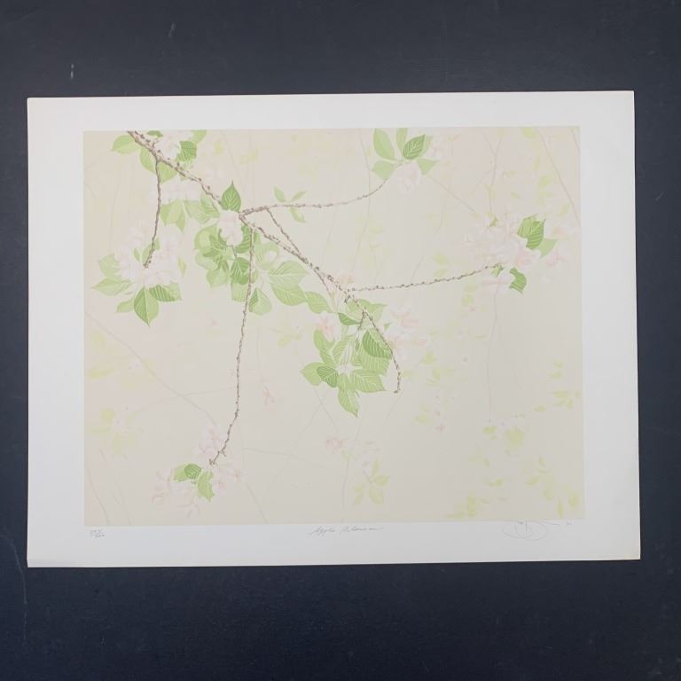 Jon D'Orazio's "Apple Blossoms" limited edition print, signed lower right, and numbered 184/300 lower left. This piece is of a few apple blossoms against a muted background. This piece is in excellent condition.