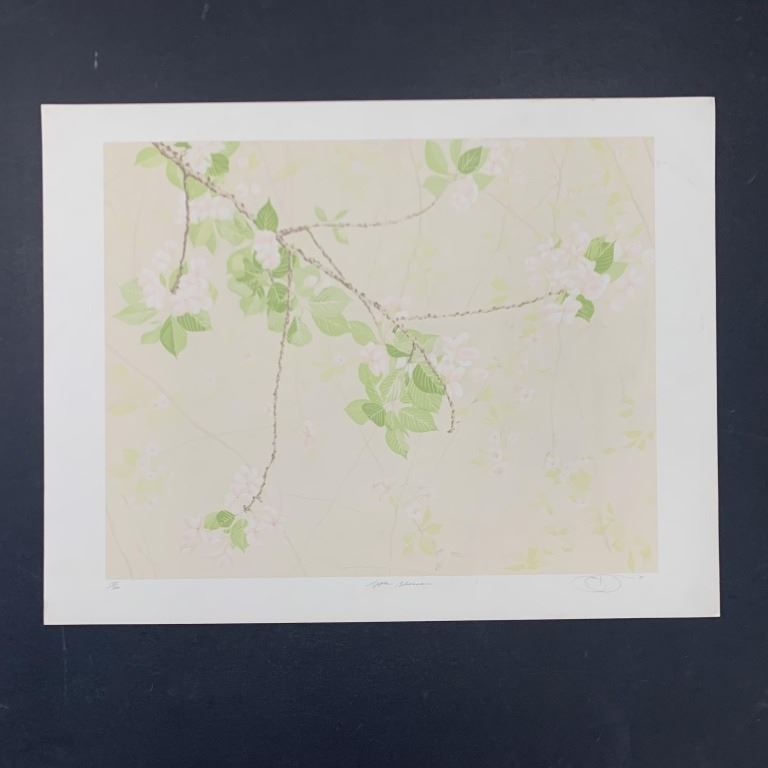 Jon D'Orazio's "Apple Blossoms" limited edition print, signed lower right, and numbered 184/300 lower left. This piece is of a few apple blossoms against a muted background. This piece is in great condition, but does have a few dirt stains at right and bottom.