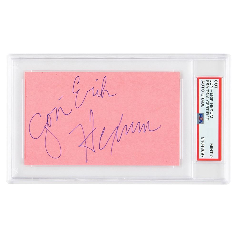 Felt tip signature, "Jon-Erik Hexum,& rdquo; on a pink 5 x 3 card. In very fine condition. Encapsulated in a PSA/DNA authentication holder, grading the autograph as "MINT 9." Given the actor& #39;s tragic death at the age of 26, Hexum& #39;s autograph remains quite scarce.