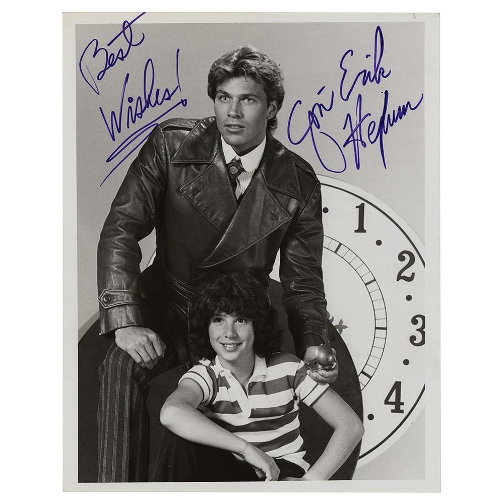 Glossy 7 x 9 photo of Hexum as 'time cop' Phineas Bogg in the 1982 TV series Voyagers!, signed in purple felt tip, "Best Wishes! Jon-Erik Hexum." In very fine condition.