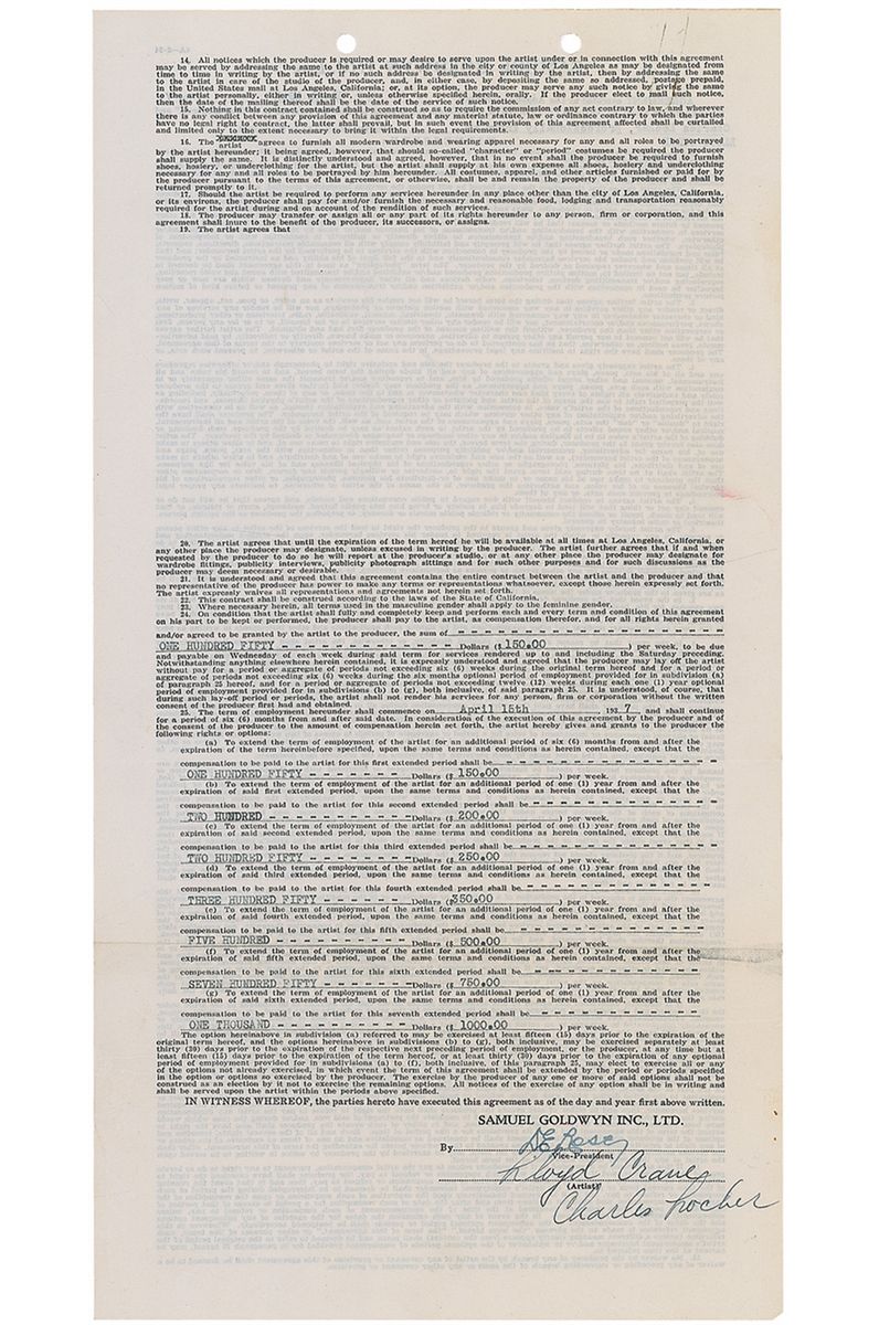 DS, signed with his real name “Lloyd Crane, Charles Locher,” one page both sides, 8.5 x 16, March 19, 1937. A contract with Samuel Goldwyn Inc. indicating Hall’s weekly compensation for various extensions to his contract. A horizontal crease to the lower half, a paperclip impression and two punch holes to the top, and some mild brushing to the signature, otherwise fine condition.