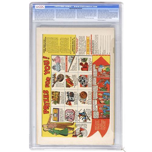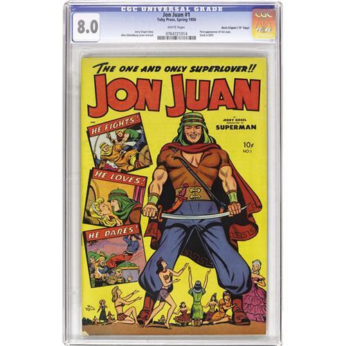 <B>Jon Juan #1 Davis Crippen ("D" Copy) pedigree (Toby Publishing, 1950) CGC VF 8.0 White pages.</B></I> Alex Schomburg cover art. Story by Jerry Siegel. Used in <B>Seduction of the Innocent</B></I>. Overstreet lists as "scarce." Overstreet 2006 VF 8.0 value = $394. CGC census 7/06: 1 in 8.0, 2 higher. <I>From the Crippen Collection.</B></I> <BR><BR><B>Important notice:</B> Heritage usually auctions material at the rate of 200-250 lots per hour. On some occasions eBay Live bid software or the Internet may not be able to keep up with the pace of the auction. We recommend placing a realistic absentee bid now as insurance to avoid disappointment. Occasionally the auctioneer may eliminate or reject an eBay Live bid, and the auctioneer may also reopen a lot after the close of the eBay live bidding (usually because we missed an audience bid), and may reject your bid even if it shows you as the winning bidder. By bidding via eBay Live, you agree that Heritage may award the lot to another bidder at its sole discretion under the circumstances described above or any other reasonable circumstances. Since eBay bids are not shown to us until we open the lot on the floor, we treat those bids just like floor bids. In most cases the floor responds before the eBay bid is presented to us, due to Internet lag time, so for consistency we have made it a policy that floor bids are always considered first over tie eBay live bids. Also please note that all Heritage lots purchased through eBay Live carry a 22.5% Buyer's Premium. Please make sure you read the Terms and Conditions before you bid. This lot is being auctioned in conjunction with a live floor auction by Heritage Auction Galleries. All final auction and invoice information will be supplied by Heritage Auction Galleries, and all other information should be considered preliminary. Lot:41001 <BR><BR><B>Winning Notification and Billing:</B> After the FINAL session in this auction is complete, Heritage will send e-mail and snail mail invoices. This process normally takes several days. All final auction and invoice information will be supplied by Heritage Auction Galleries, and all other information should be considered preliminary. <BR><BR>This auction will be conducted on a live auction floor and over the Internet through eBay Live. If you choose to place an absentee bid, please take a moment to <font color='#0000ff'><u><a href='http://pages.ebay.com/liveauctions/help/before/laabsentee.html'>learn how eBay Live absentee bidding works</a></u></font><font color='#000000'>
