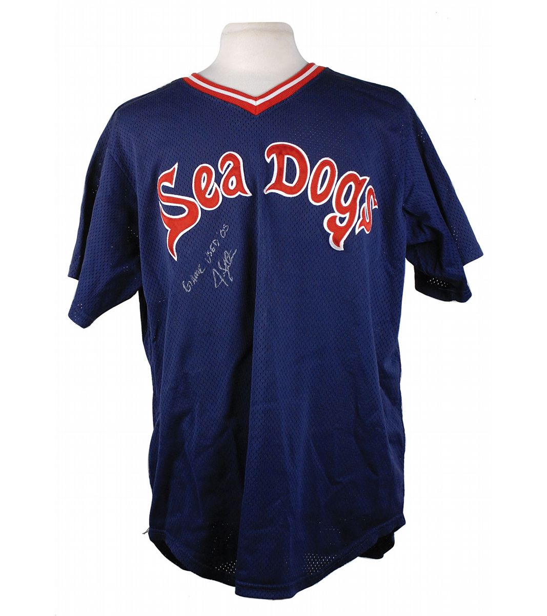 Official Wilson game-worn Portland Sea Dogs baseball jersey, with sewn on letters and numbers, signed in silver ink on the front, “Game used ’05, Jon Lester.” In fine condition. Accompanied by a letter of authenticity from the vice president of the Sea Dogs which states, “Jon Lester wore Batting Practice Jersey #31 during the 2005 Portland Sea Dogs season. This is a game-worn jersey.”