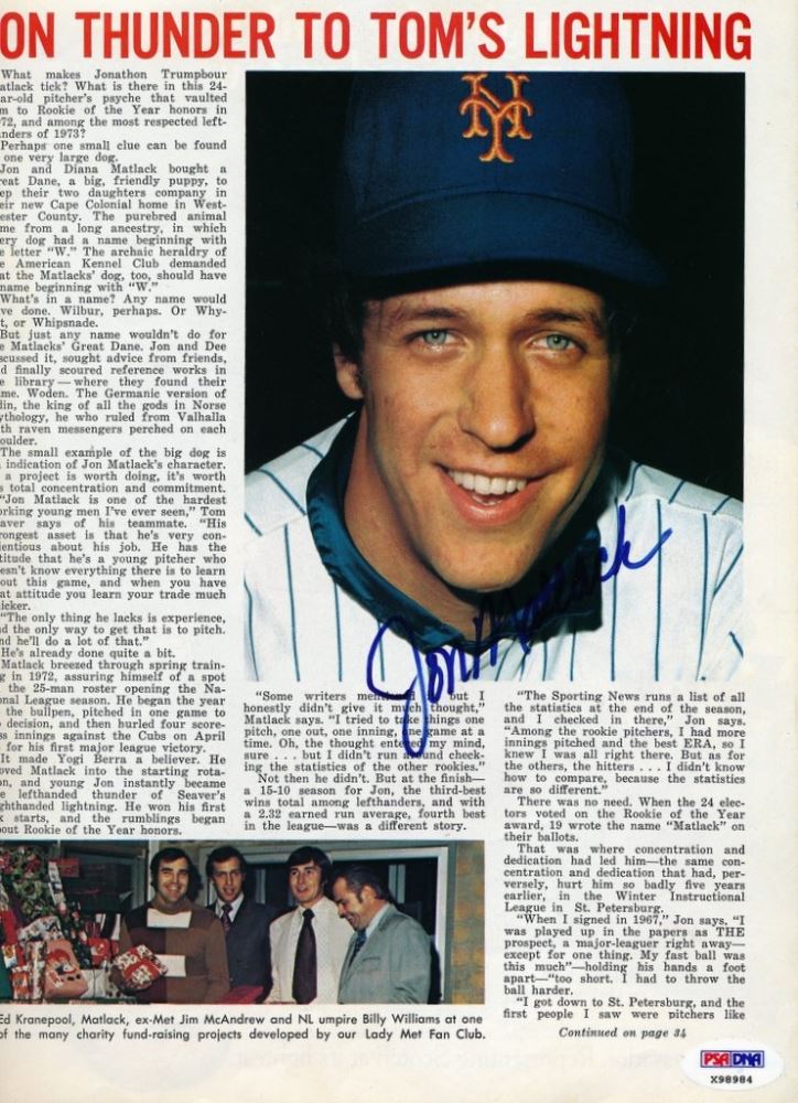 Vintage 1974 Mets Program has been hand-signed in blue felt-tip pen by Jon Matlack (Mets) & Cleon Jones (Mets). Please note that the program has been signed twice by Jon Matlack. The autograph includes an official PSA/DNA hologram and matching COA for authenticity purposes.