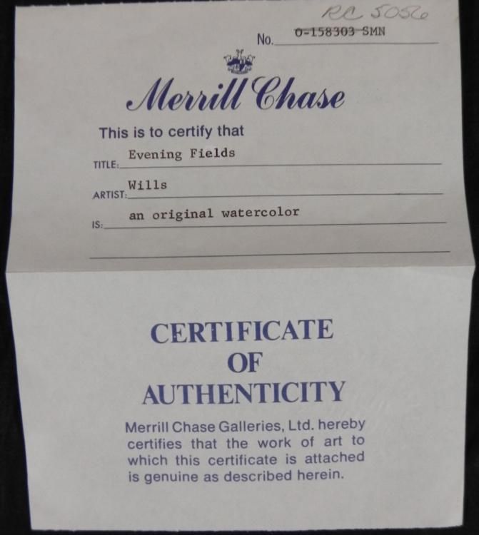 This rural landscape portrays an old barn, and some antique farm equipment still laying in the field. * Artist: Jon WillsSignature: Signed "Wills" and dated in paint, lower rightTitle: Evening FieldsMedium: Watercolor on paperEdition: Ninth of a seriesYear: 1977Image size: 9 1/2 x 11 1/2 inchesFraming: Matted in linen matte, in gold painted and brown wood frameCondition: Artwork is excellent; some scuffs to frame, and staining to the matte, lower rightCertificate of Authenticity: From Merrill Chase Galleries *