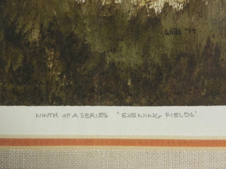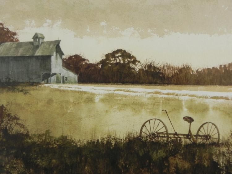 This rural landscape portrays an old barn, and some antique farm equipment still laying in the field. Artist: Jon WillsSignature: Signed "Wills" and dated in paint, lower rightTitle: Evening FieldsMedium: Watercolor on paperEdition: Ninth of a seriesYear: 1977Image size: 9 1/2 x 11 1/2 inchesFraming: Matted in linen matte, in gold painted and brown wood frameCondition: Artwork is excellent; some scuffs to frame, and staining to the matte, lower rightCertificate of Authenticity: From Merrill Chase Galleries