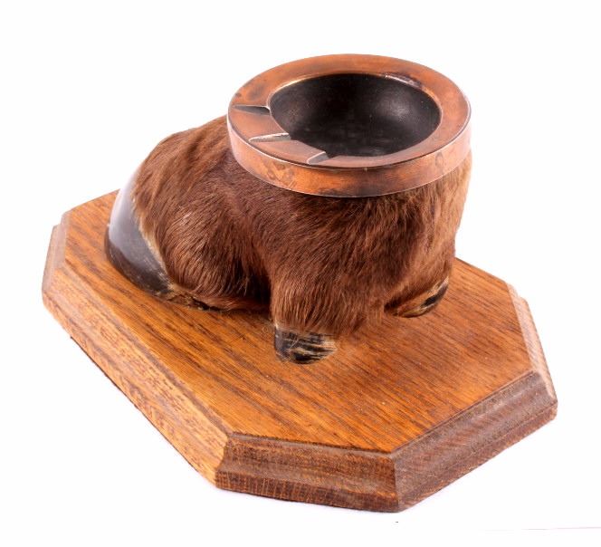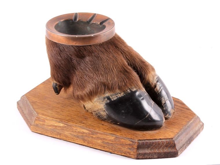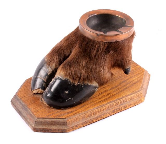 This is an elk hoof ashtray made by Jonas Brothers. The hoof is mounted to a solid oak base. The ashtray is removable and is marked "Mfg By Jonas Bros Inc. Denver Colo.". The ashtray is in good condition. It measures 8" x 11.5" and is 6" tall.