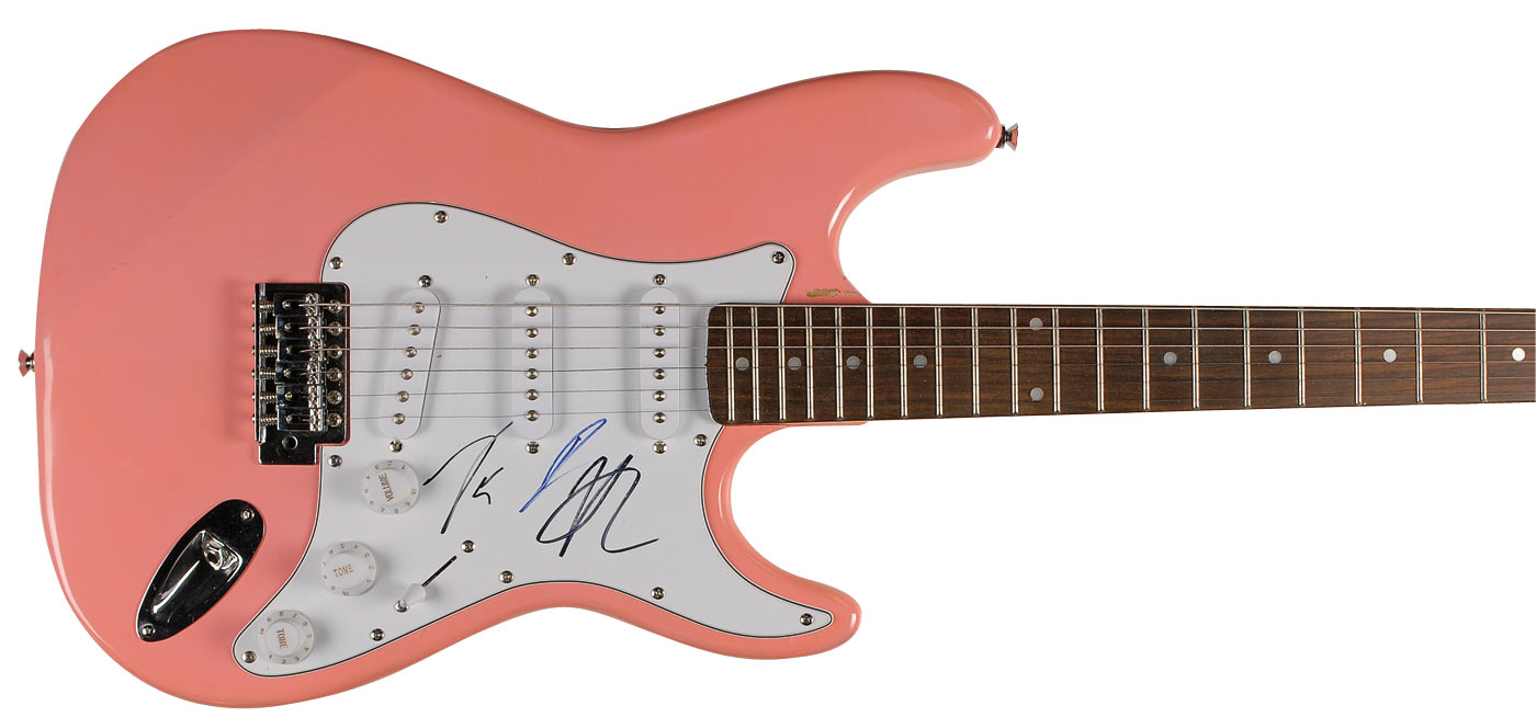 Peach-colored Stedman Pro ‘stratocaster-style’ electric guitar signed on the white pickguard in blue and black felt tip by Kevin, Joe, and Nick Jonas. In fine condition, with a few dings and spots of paint loss. Oversized.
