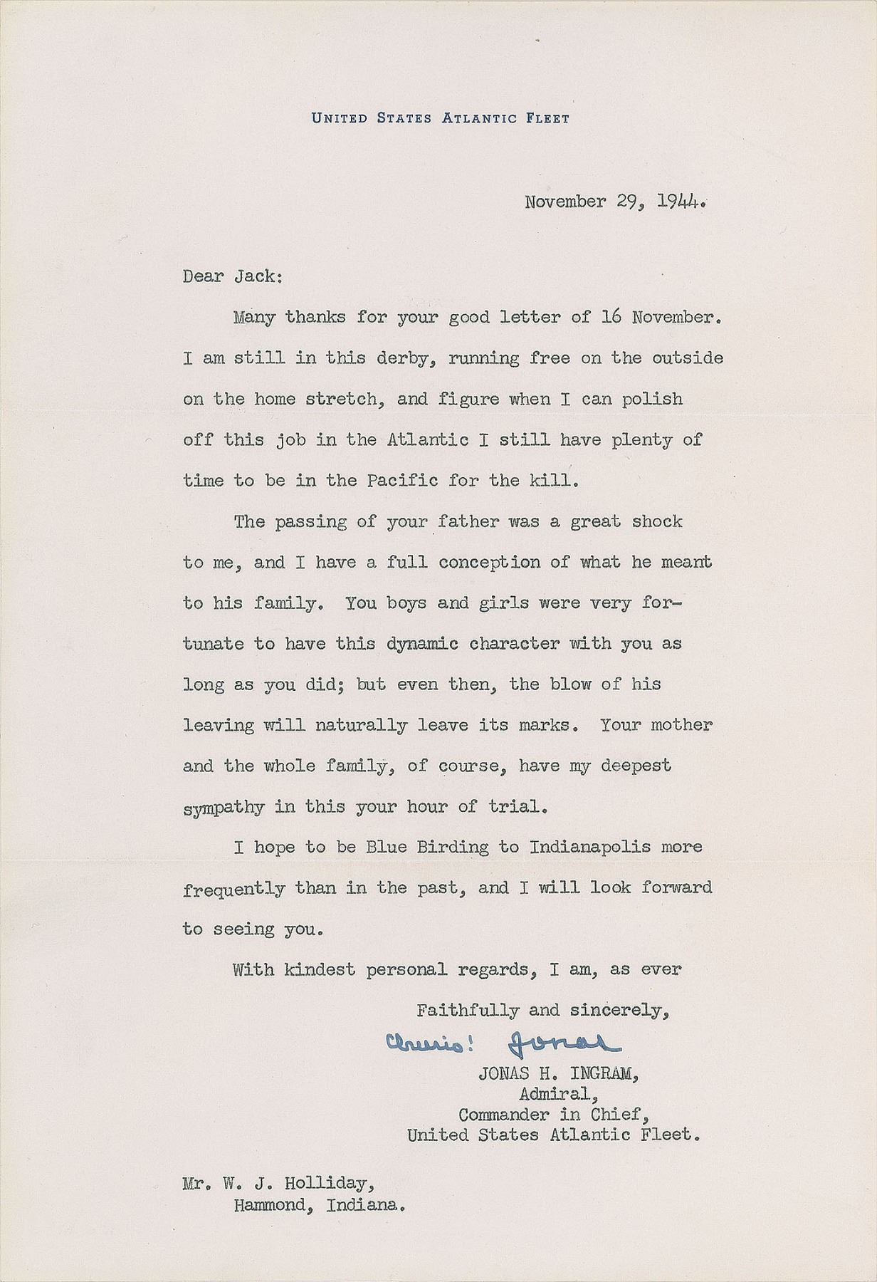 US Navy officer (1886–1952) who served in both World Wars, commanding the United States Atlantic Fleet during World War II; he received the Medal of Honor for his actions in 1914 in Veracruz, Mexico. War-dated TLS signed “Cheerio! Jonas,” one page, 7.25 x 10.5, United States Atlantic Fleet letterhead, November 29, 1944. Letter to W. J. Holliday in Hammond, Indiana. In part: "I am still in this derby, running free on the outside on the home stretch, and figure when I can polish off this job in the Atlantic I still have plenty of time to be in the Pacific for the kill. The passing of your father was a great shock to me, and I have a full conception of what he meant to his family. You boys and girls were very fortunate to have this dynamic character with you as long as you did; but even then, the blow of his leaving will naturally leave its marks. Your mother and the whole family, of course, have my deepest sympathy in this your hour of trial." In fine condition. Accompanied by the original mailing envelope, marked with an initialed "Passed by Naval Censor" stamp. An excellent letter boasting an exhilarating wartime sentiment from the heroic naval commander.