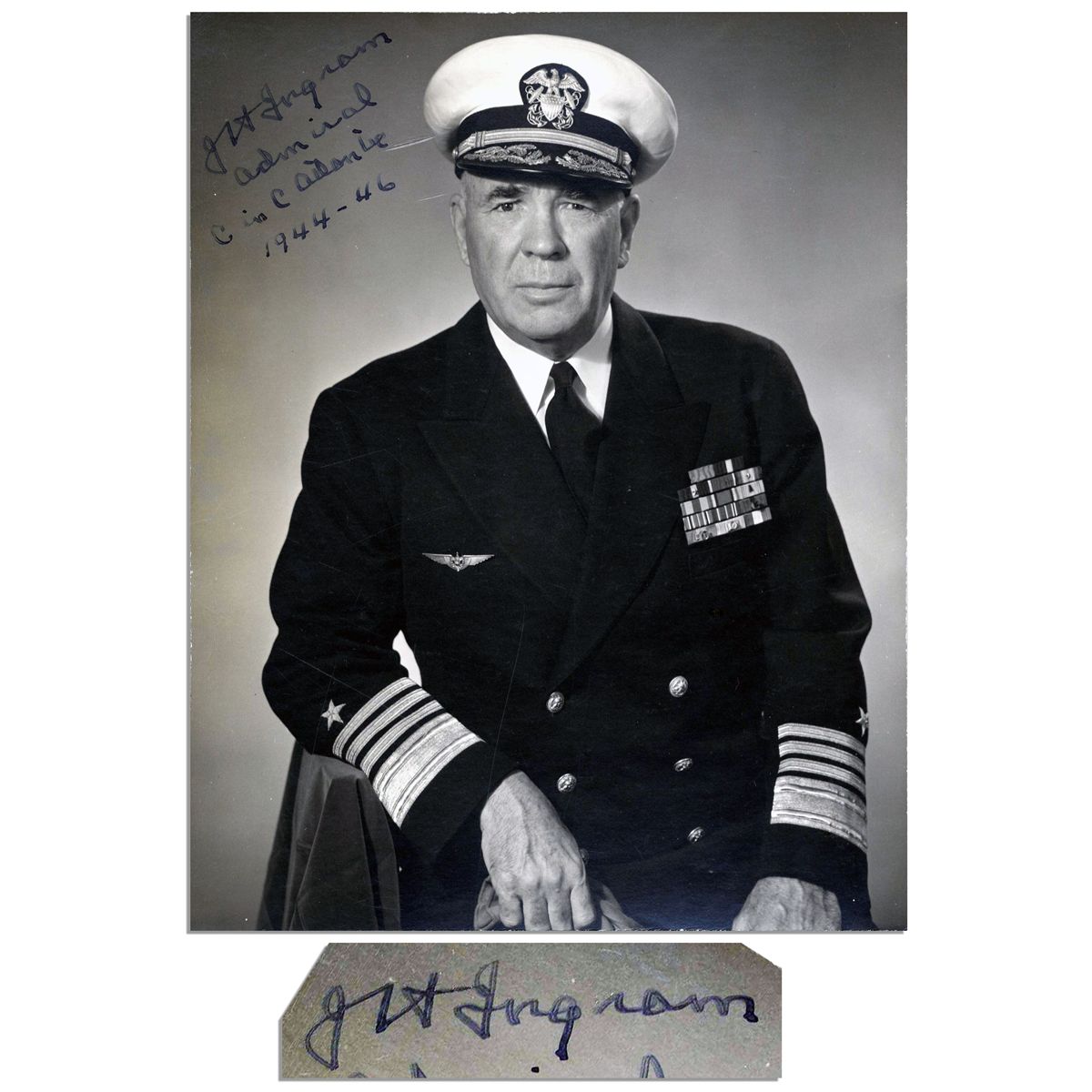 Admiral Jonas Ingram signed 8'' x 10'' semi-matte photo. He signs: ''JH Ingram / Admiral / C in C Atlantic / 1944-46''. The inscription refers to his position as Commander in Chief of the Atlantic Fleet during World War II. Early in his career, he received a Medal of Honor, the highest military decoration, for service during a 1914 confrontation between the U.S. and Mexico. Ingram served in both World Wars and was also head football coach at the Naval Academy in 1915-16. Minor creasing to photo, else very good.