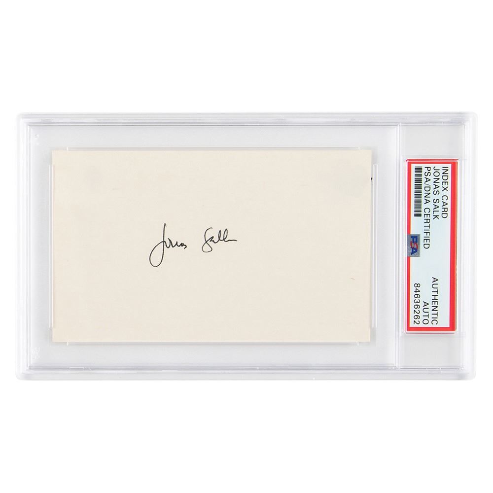 Felt tip signature, "Jonas Salk,†on an off-white 5 x 3 card. In fine condition, with light show-through at the top corners from small mounting remnants on the back. Encapsulated in a PSA/DNA authentication holder.
