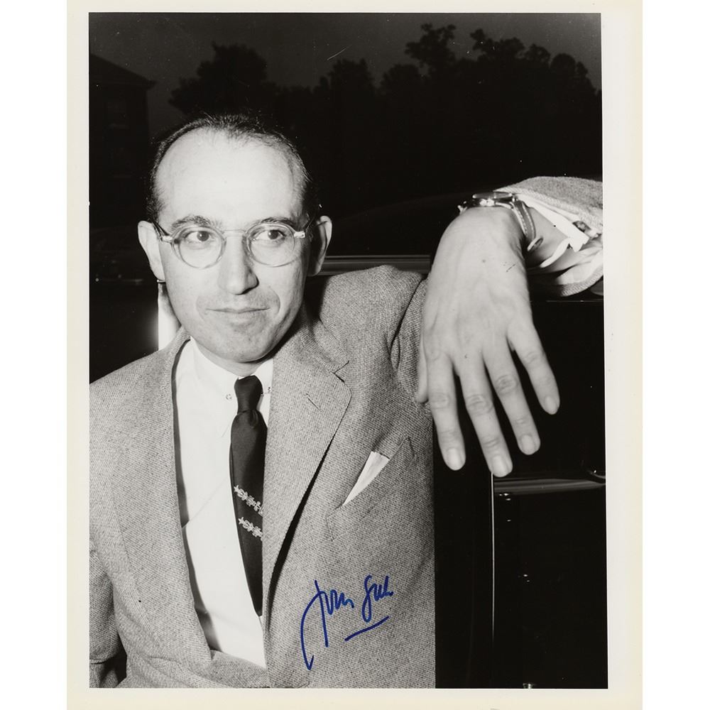 Glossy 8 x 10 photo of Jonas Salk, signed nicely in blue felt tip. In fine condition. Originally obtained by in-person specialist Mike Wehrmann.