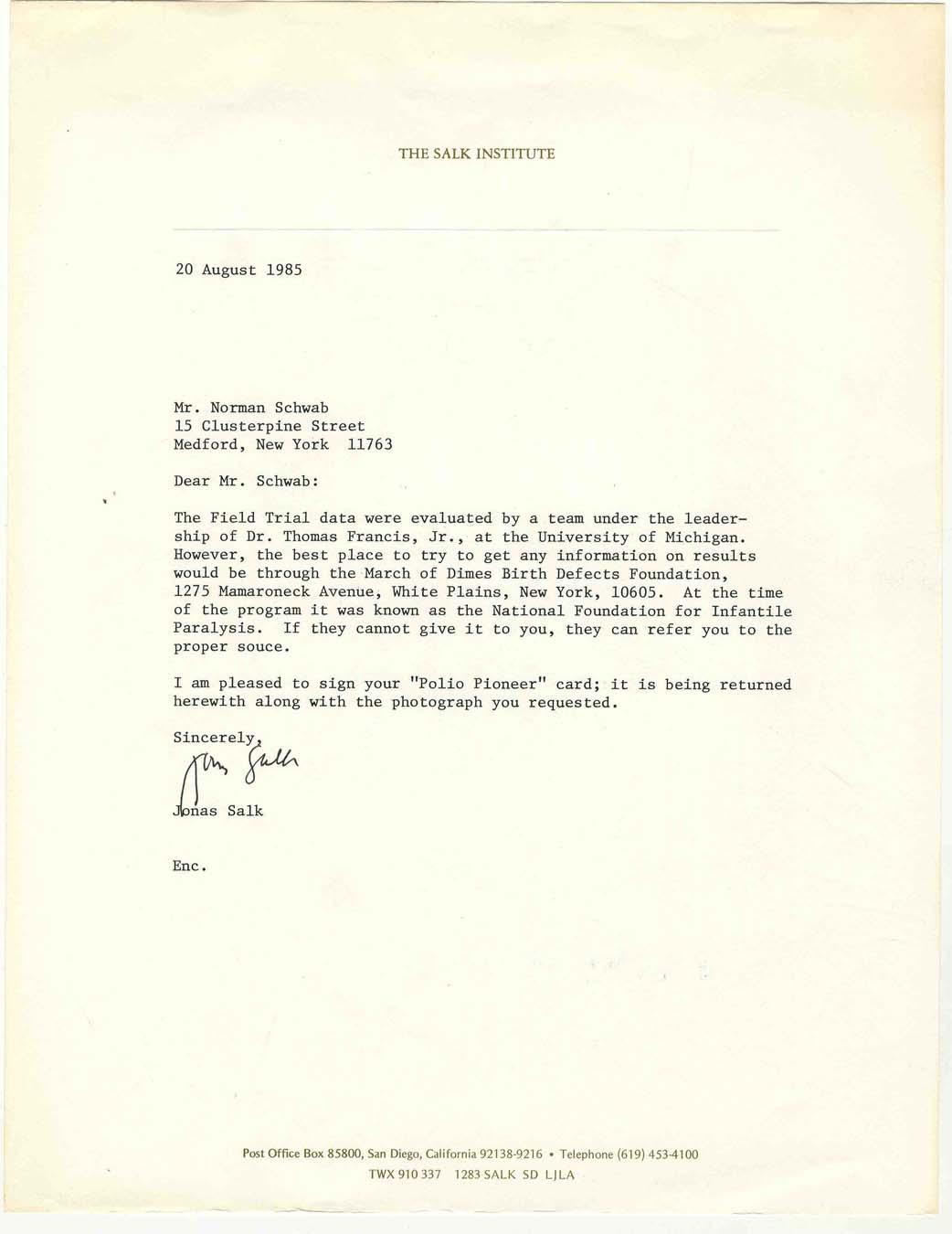 Polio vaccine pioneer Jonas Salk typed letter signed on official Salk Institute stationery, dated 20 August 1985. The letter is addressed to a Mr. Norman Schwab, a former polio vaccine trial patient, and reads in part, ''The Field Trial data were evaluated by a team under the leadership of Dr. Thomas Francis, Jr., at the University of Michigan…I am pleased to sign your Polio Pioneer card; it is being returned herewith…Sincerely, Jonas Salk''. Letter measures 8.5'' x 11'' with a clear signature. Fine condition.