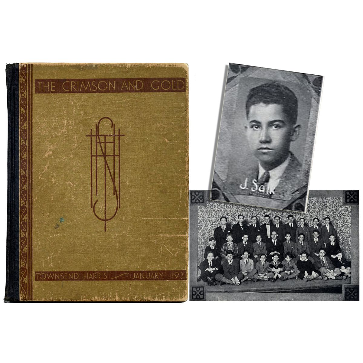 1931 yearbook from Townsend Harris High School in Manhattan featuring the senior class photo of Jonas Salk, who went on to develop the polio vaccine. Townsend was a public school for gifted students where Salk matriculated at age 13 and graduated at 15. He is pictured throughout, including on the yearbook and newspaper pages, the information bureau and history society clubs. 8'' x 10.5'' book has some dampstaining on pastedowns, light wear and minor tearing at hinges. Pages are all intact. Overall in good condition.