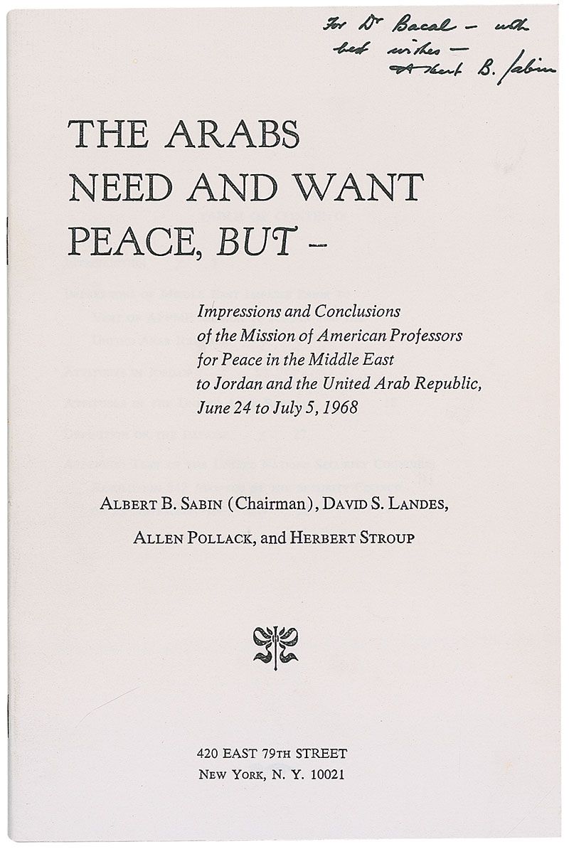 Two items: one FDC with a cachet honoring the Mayo brothers, signed in black felt tip, “Jonas Salk”; and one booklet entitled ‘The Arabs Need and Want Peace, But,’ 6 x 9, 31 pages, signed and inscribed in black felt tip, “For Dr. Bacal—with best wishes—Albert B. Sabin.” In overall very fine condition.