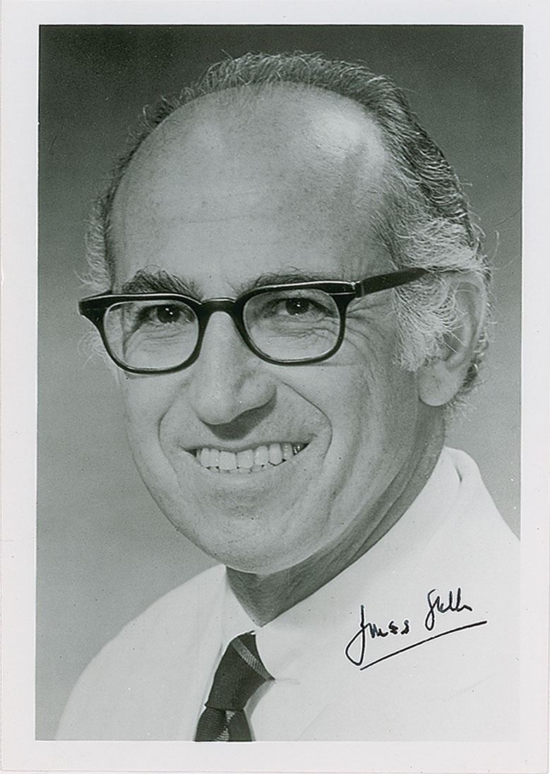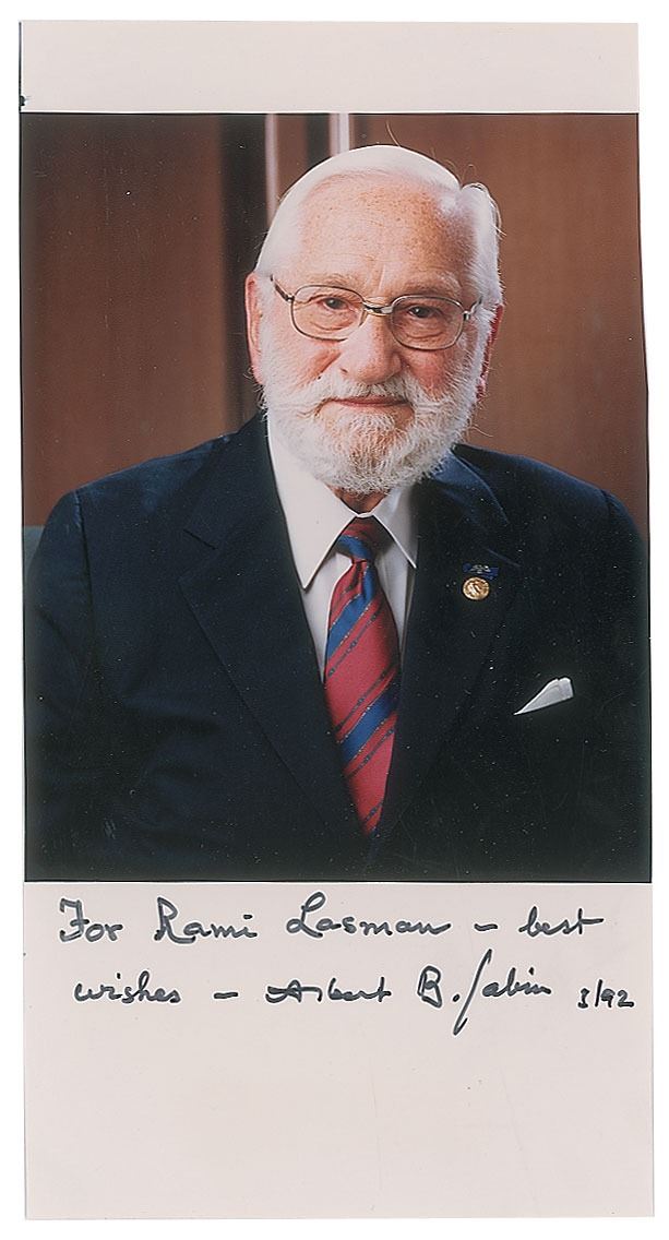 Two items: a glossy 5 x 7 photo of Salk in his coat and tie, signed in black felt tip, "Jonas Salk"; and a color glossy 3.75 x 7 photo of Sabin in a suit and tie, signed and inscribed in the lower border, "For Rami Lasman—best wishes—Albert B. Sabin, 3/92." In overall fine condition.