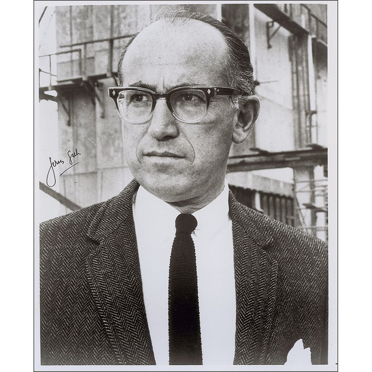 Glossy 8 x 10 photo of Salk in a suit and tie, signed in black felt tip. In fine condition, with light creasing towards the bottom right corner.