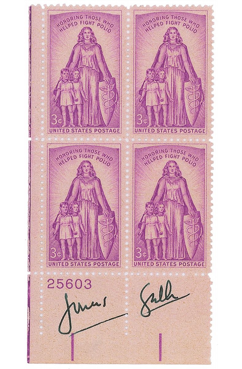 Block of four US postage stamps honoring those who helped fight polio, 2.25 x 4, signed in the lower border in black ink. In fine condition.