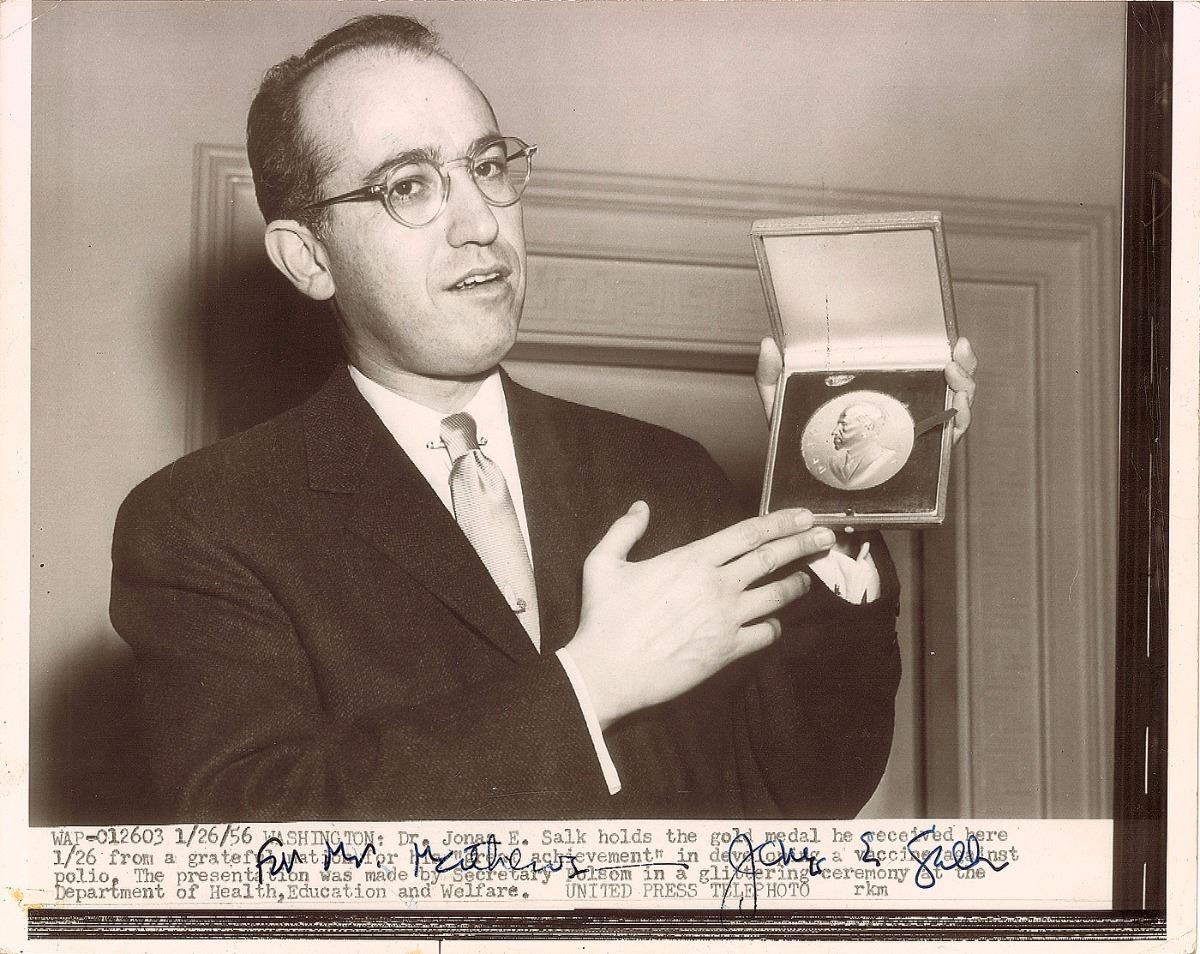 Glossy 9 x 7 press photo of Salk displaying the Congressional Gold Medal awarded to him for his achievement in eradicating polio, signed and inscribed in fountain pen, “For Mr. Mathews—Jonas E. Salk.” In fine condition, with trimmed edges.