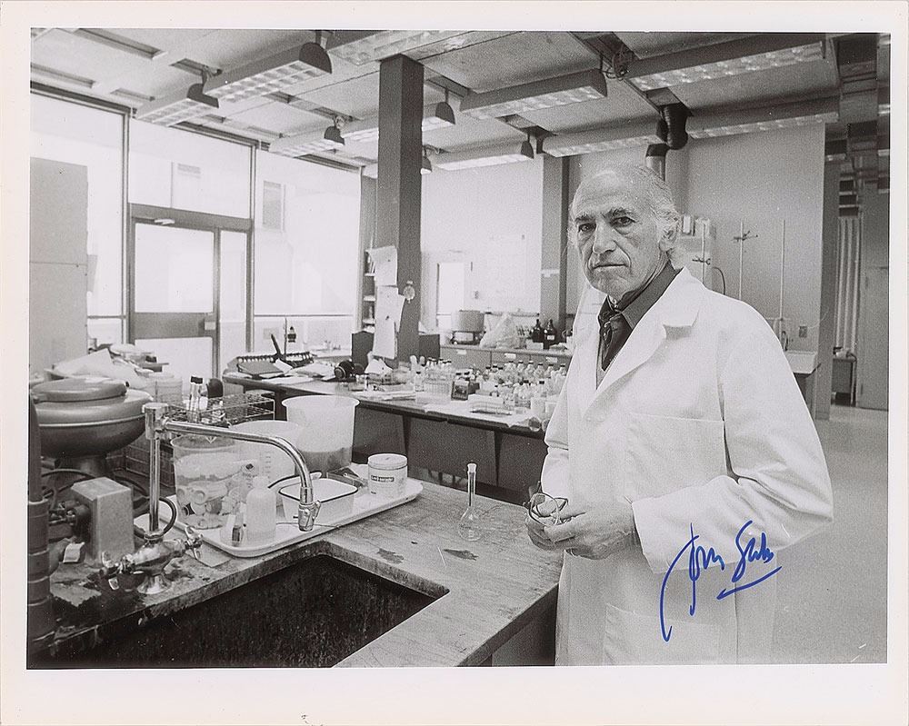 American medical researcher and virologist (1914–1995) known for developing the polio vaccine. Glossy 10 x 8 photo of Salk in a scientific laboratory, signed in blue felt tip. In fine condition. Originally obtained by in-person specialist Mike Wehrmann.