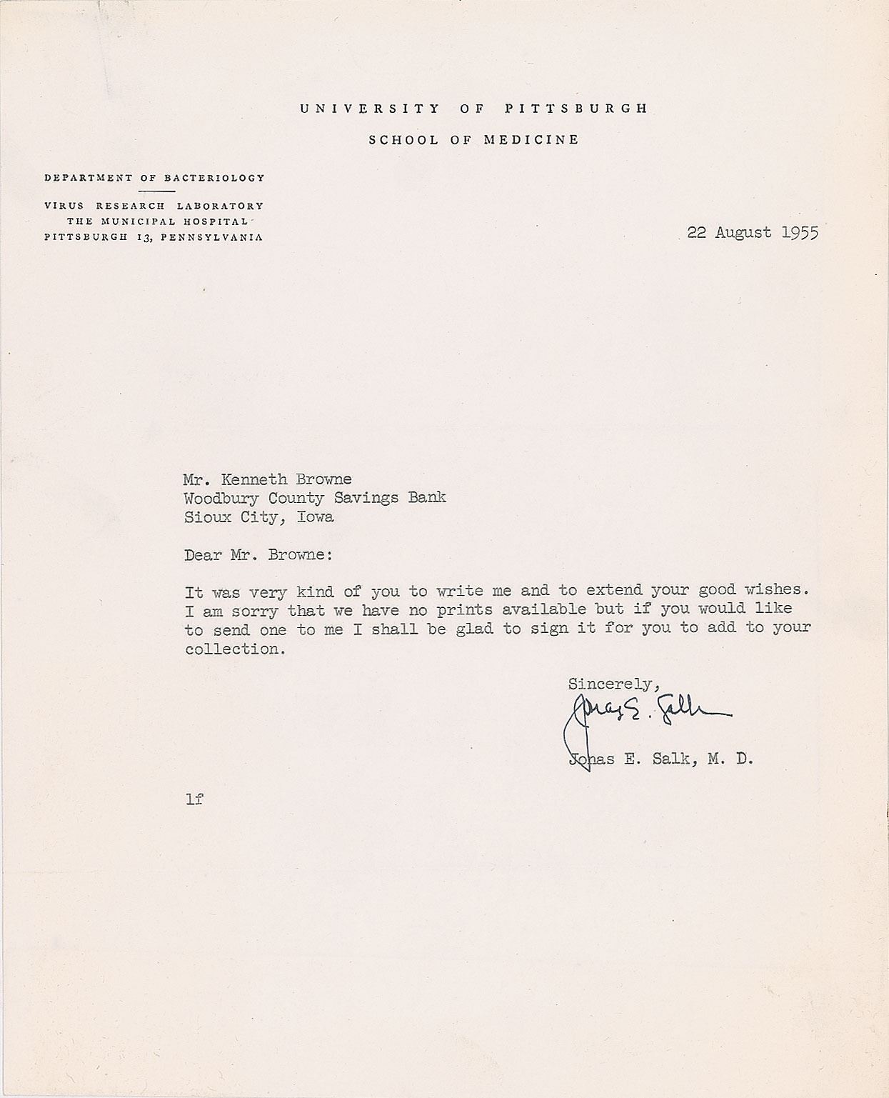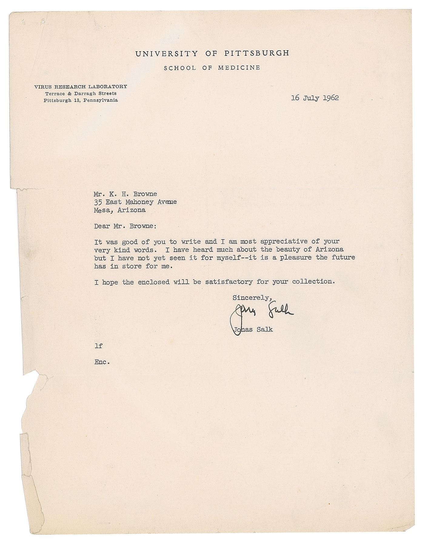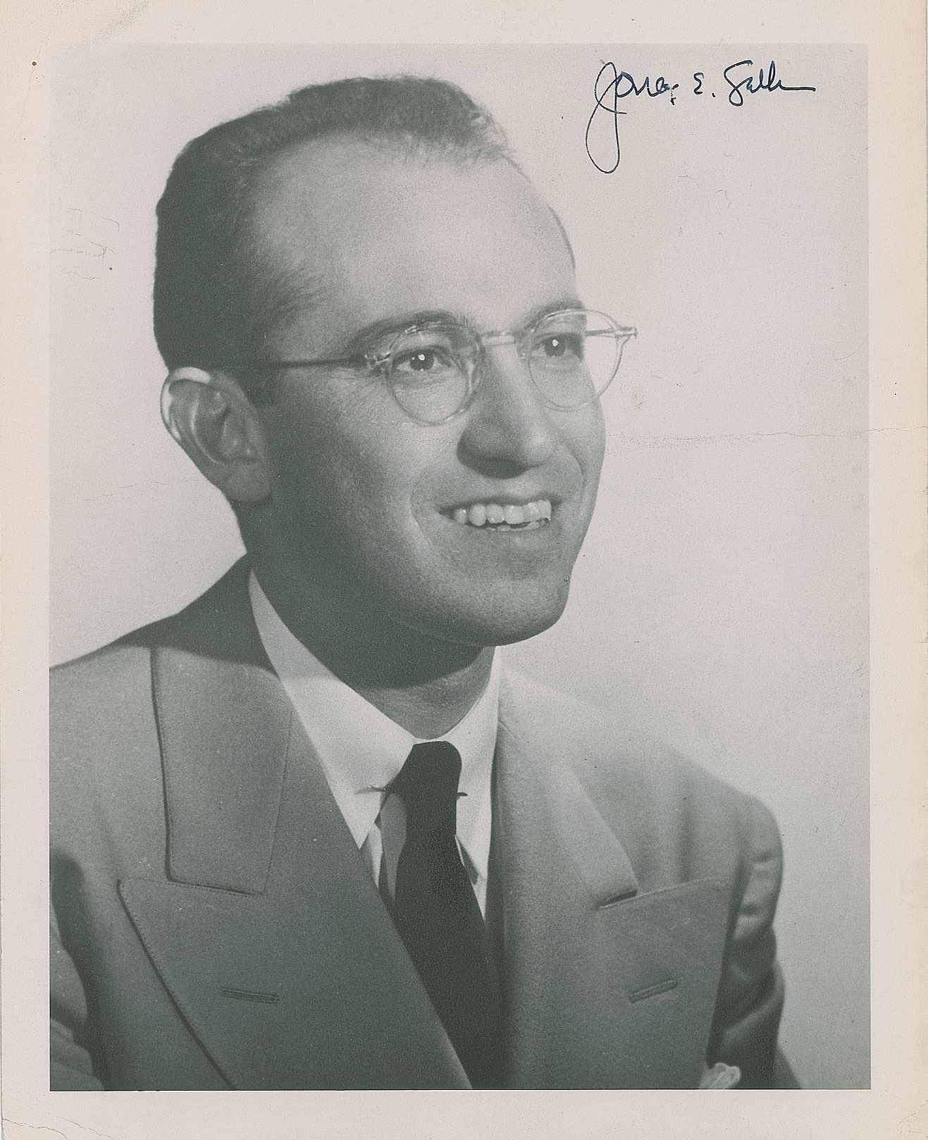Four items: a matte-finish 8 x 10 photo of the creator of the first polio vaccine, signed in black ink, "Jonas E. Salk"; and a set of three brief TLSs, each one page, dated to 1955, 1962, and 1975, each addressed to Ken Browne and offering his well wishes. In overall very good to fine condition, with a rough left edge to one of the letters, and a horizontal crease across the photo which passes through Salk's face. Accompanied by two original mailing envelopes.