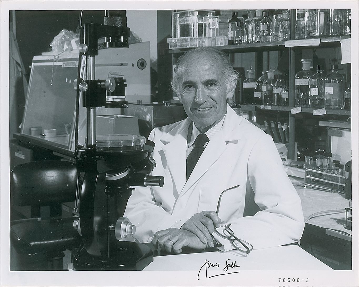 American medical researcher and virologist (1914–1995) known for developing the polio vaccine. Glossy 10 x 8 photo of Salk in his lab, signed at the bottom in black felt tip. In fine condition.