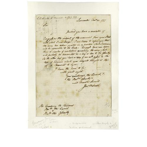 <B>Jonathan B. Smith (1742-1812) Signer of the Articles of Confederation, Autograph Letter Signed,</B></I> "<I>Jona. B. Smith</B></I>" one page with integral address leaf addressed in his hand and an attached two page Autograph Document, 7.25" x 9.75", Lancaster, [Pennsylvania], December 22, 1777 to Thomas Wharton, President of Pennsylvania. Writing from Lancaster where Congress had fled following the British capture of Philadelphia, Smith happily reports that "<I>...the army has taken quarters in a position which I presume will be agreeable to the State. Congress have now before them a number of resolutions concerning the army which will probably be transmitted in a day or two to the Assembly. On the other leaf you have a copy of an act passed by the State of Virginia which your delegates thought it their [interest] to transmit to you...</B></I>" True to his word, he has transcribed the legislation from Virginia authorizing the procurement of clothing. The army's position to which Smith refers was of course Valley Forge, Pennsylvania where Washington and his army remained in great misery until the British evacuated Philadelphia in the Spring of 1778. Light toning along folds, neatly laid in to a larger sheet, small loss from seal tear resulting in loss of one word, and other tears repaired, else very good condition. Given the resonance of "Valley Forge" to all students of American history, any document noting that encampment retains incredible verve. From the Henry E. Luhrs Collection. Accompanied by LOA from PSA/DNA.