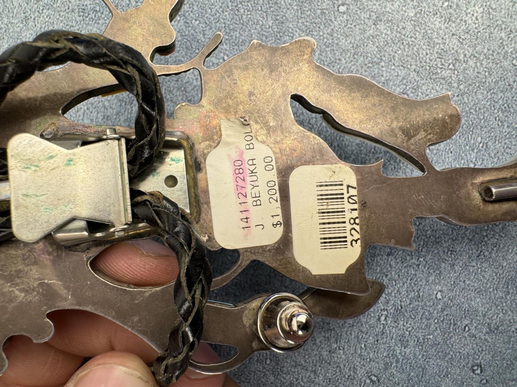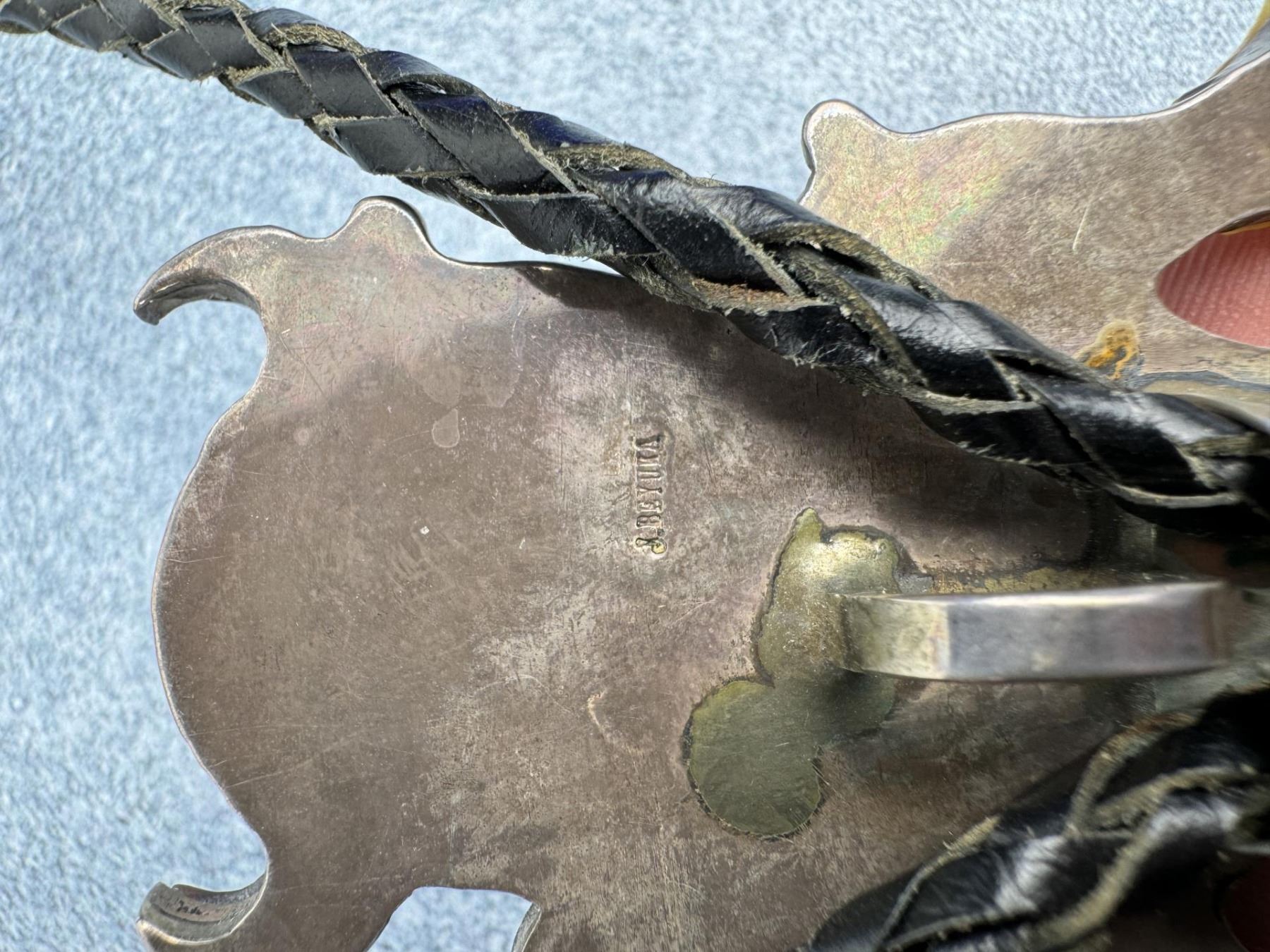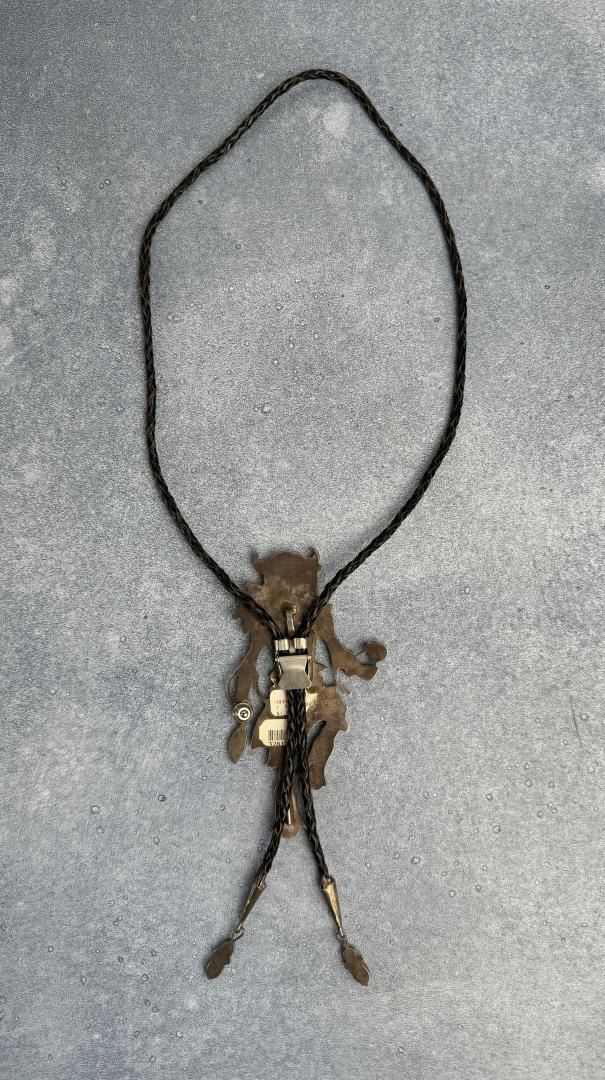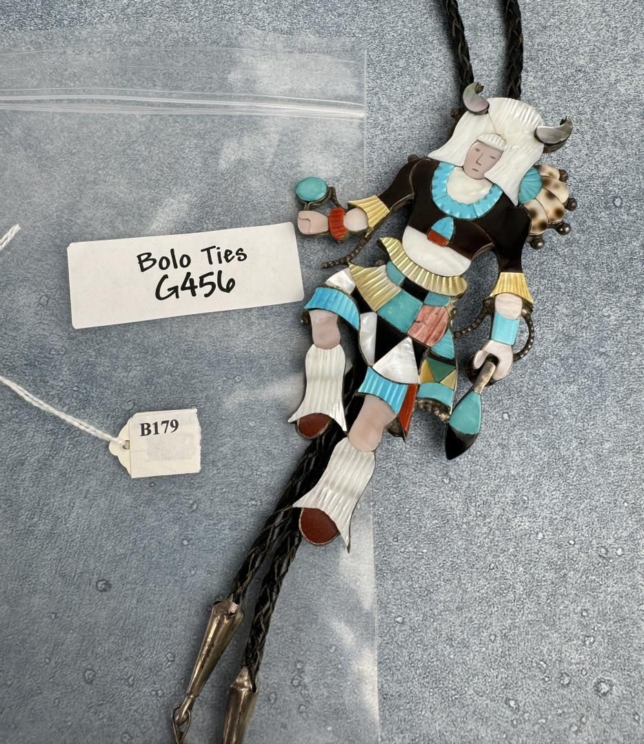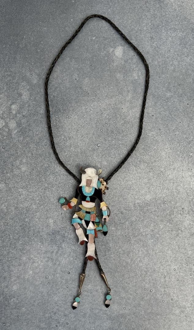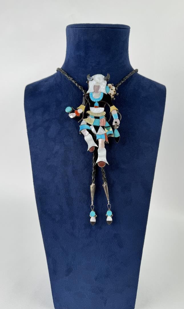 Incredible details on this large and impressive multi stone inlay Kachina Dancer bolo tie. measures 21" long. Slide is 3" wide. Norman Sandfield Collection Inv: B179