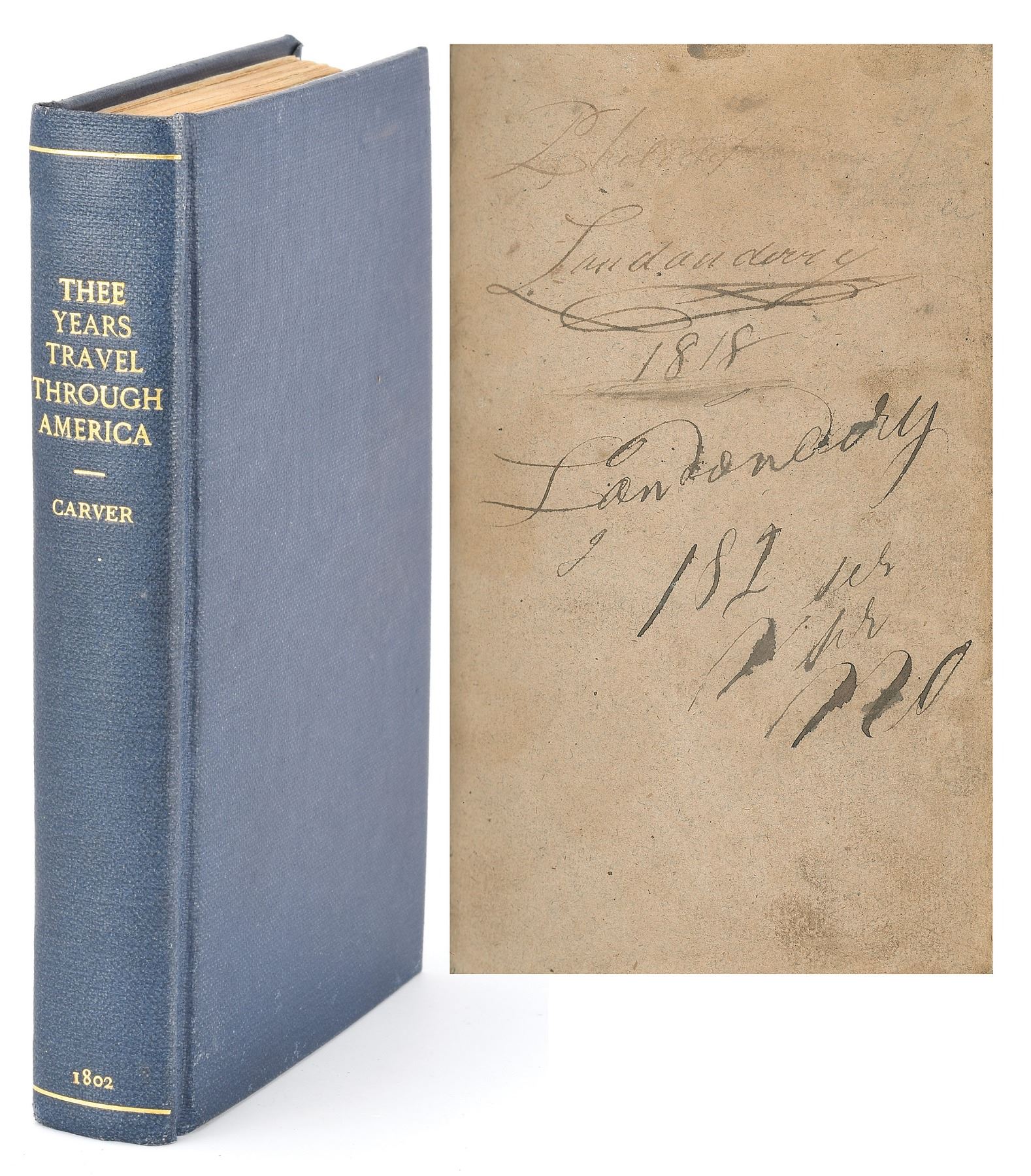 Desirable book: Three Years Travels Throughout the Interior Parts of North America by Capt. Jonathan Carver. Later printing. Charlestown and Boston: Printed by Samuel Etheridge for West and Greenleaf, 1802. Rebound hardcover, 4.25 x 6.75, 312 pages. Condition: VG/None, with 19th-century annotations to original endpapers, which have been laid down to modern endpapers in the new binding; a "Gordon W. Jones, M. D., Falmouth, Virginia" bookplate is affixed inside the cover. Capt. Jonathan Carver's account of his travels along the Mississippi River through present-day Wisconsin, Minnesota, and Iowa was first published in 1778; it describes the geography and fauna of the these 'northwest' regions of North America, as well as a "concise history of the genius, manners, and customs of the Indians."