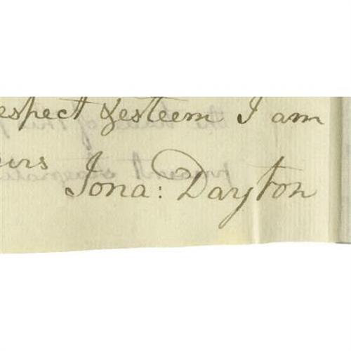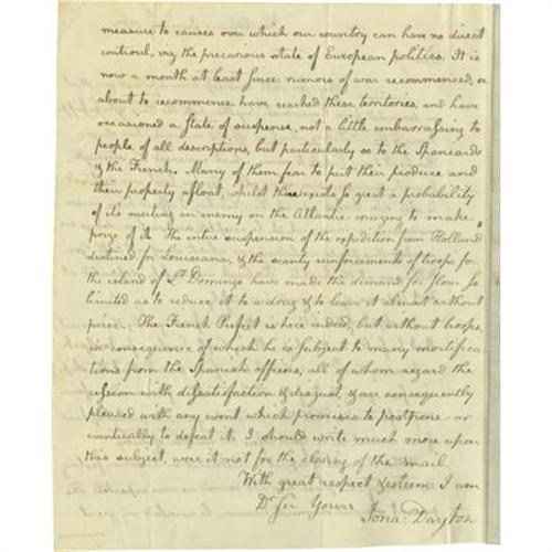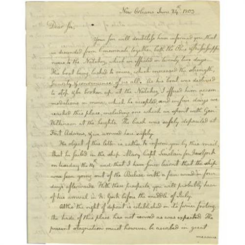 <B>(New Orleans) Jonathan Dayton Autograph Letter Signed </B></I>"<I>Jona. Dayton.</B></I>" One page, 8" x 10", New Orleans, June 24, 1803 to an unknown correspondent. Dayton (1760-1824), a signer of the Constitution and at the time of this letter he was a Senator from New Jersey. In this letter he announces his arrival at New Orleans and makes important observations regarding the confused political situation there. In part: "<I>... Altho' the right of deposit is established on it's former footing, the trade of this place has not revived as was expected. The present stagnation must however be ascribed in great measure to causes over which our country can have no direct controul </B></I> <I>sic</B></I> <I>, viz. the precarious state of European politics. It is now a month at least since rumors of war recommenced, or about to recommence, have reached these territories, and have occasioned a slate of suspense, not a little embarrassing to people of all descriptions, but particularly so to the Spaniards of the French. Many of them fear to put their produce and their property afloat, whilst there exist so great a probability of it's meeting an enemy on the Atlantic cruising to make prize of it. The entire suspension of the expedition from Holland destined for Louisiana, & the scanty reinforcements of troops for the island of St. Domingo have made the demand for flour so limited as to reduce it to a drug & to leave it almost without price. The French Prefect is here indeed, but without troops, in consequence of which he is subject to many mortifications form the Spanish officers, all of whom regard the cession with dissatisfaction & disgust, & are consequently pleased with any event which promises to postpone or eventually to defeat it. I should write much more upon this subject, were it not for the closing of the mail...</B></I>" They were completely unaware that in two weeks Thomas Jefferson would announce the Louisiana Purchase. The city was under formal American control by the end of the year. Dayton's visit to New Orleans caused him to break with the Federalist Party and argue in favor of the ratification of the treaty which doubled the size of the United States. Light folds, left margin reinforced on verso with paper, else fine. <BR><BR><b>Shipping:</b> Flat Material, Small (<a target="_blank" href="http://www.heritageauctions.com/common/shipping.php">view shipping information</a>)