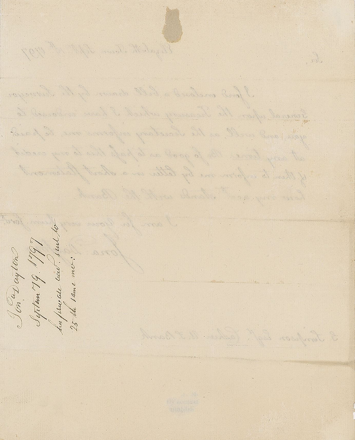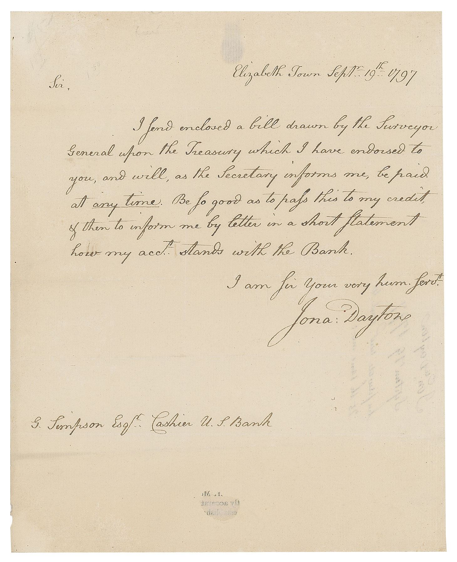 ALS signed “Jona: Dayton,” one page, 8 x 9.75, September 19, 1797. Neatly penned letter to George Simpson, the cashier of the United States Bank, in full: "I send enclosed a bill drawn by the Surveyor General upon the Treasury which I have endorsed to you, and will, as the Secretary informs me, be paid at any time. Be so good as to pass this to my credit & then to inform me by letter in a short statement how my acc't stands with the Bank." In fine condition, with light show-through at the top from a small mounting remnant on the back, and a small bit of residue from an old clipping that was once affixed to the bottom.
