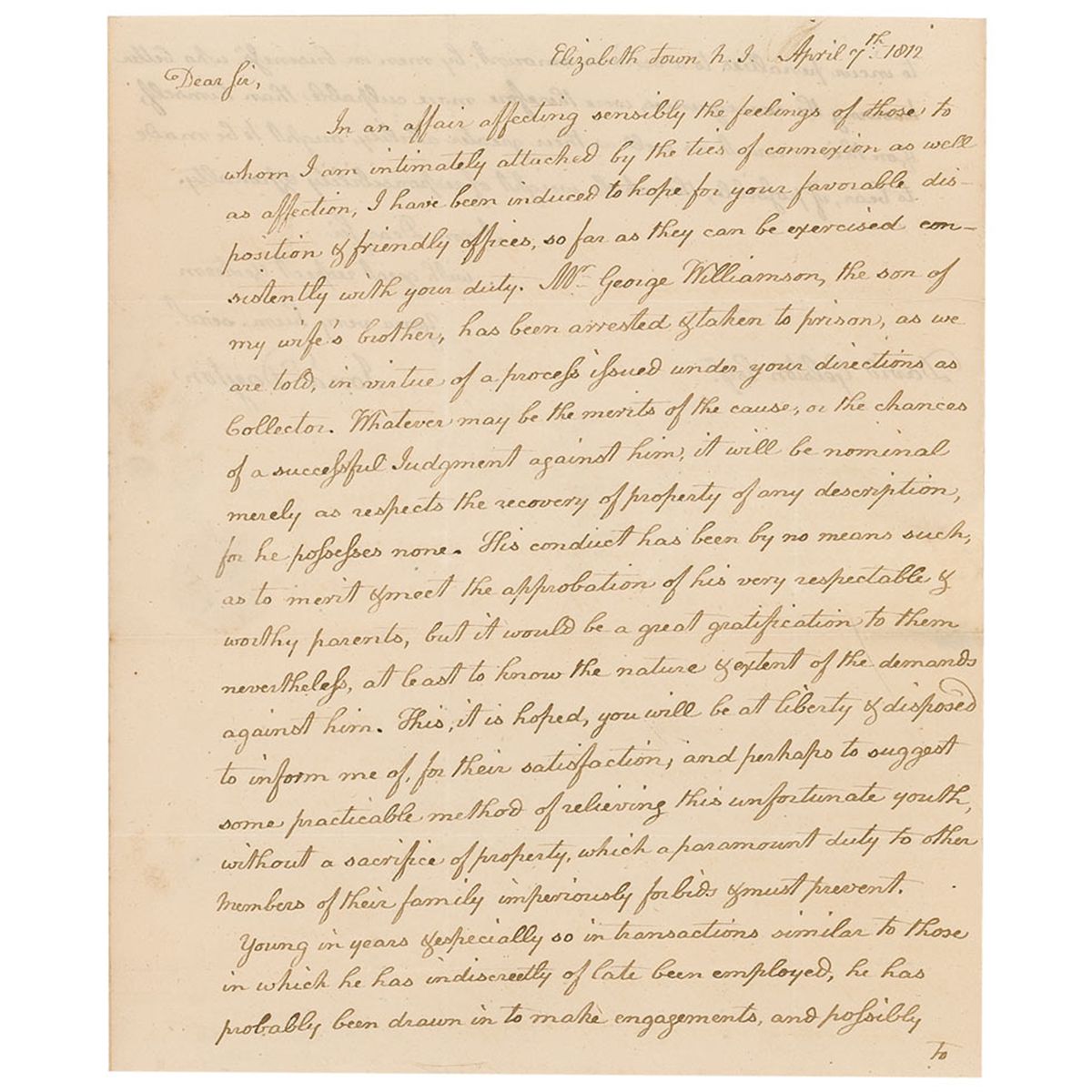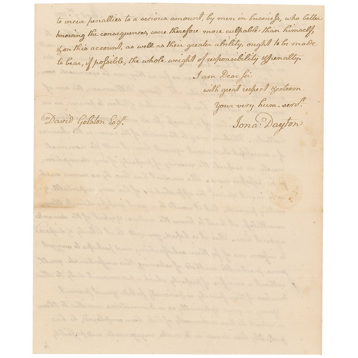American statesman (1760–1824) who was the youngest signer of the US Constitution and who later served as the fourth Speaker of the House of Representatives and as a member of the Senate. Arrested in 1807 in connection with the Aaron Burr conspiracy case, he was never tried, but the scandal effectively ended his political career. ALS signed “Jona: Dayton,” one page both sides, 8 x 9.75, April 7, 1812. Letter to David Gelston, Collector of the Port of New York. In part: “Mr. George Williamson, the son of my wife’s brother, has been arrested and taken to prison, as we are told, in virtue of a process issued under your directions as Collector. Whatever may be the merits of the cause, or the chances of a successful Judgement against him, it will be nominally merely as respects the recovery of property of any description, for he professes none. His conduct has been by no means such as to merit & meet the approbation of his very respectable & worthy parents, but it would be a great gratification to them nevertheless, at least to know the nature & extent of the demands against him.” Second integral page bears an address panel in Dayton’s hand. In fine condition, with intersecting folds and some scattered light toning.