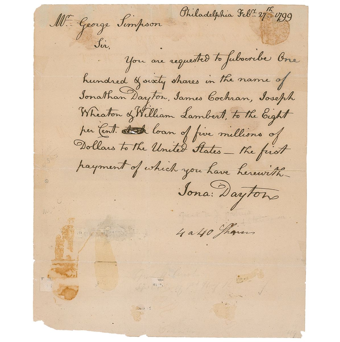 American statesman (1760–1824) who was the youngest signer of the US Constitution and who later served as the fourth Speaker of the House of Representatives and as a member of the Senate. Arrested in 1807 in connection with the Aaron Burr conspiracy case, he was never tried, but the scandal effectively ended his political career. ALS signed “Jona. Dayton,” one page, 8 x 9.5, February 27, 1799. Dayton writes to George Simpson, in full: “You are requested to subscribe One hundred & sixty shares in the name of Jonathan Dayton, James Cochran, Joseph Wheaton & William Lambert, to the Eight per Cent loan of five millions of Dollars to the United States—the first payment of which you have herewith.” Intersecting folds, a few small fold separations, scattered toning and soiling, show-through from mounting remnants on the reverse, a few tears to the left edge, and a couple of pieces of reparative tape to the edges, along with a full strip across one of the horizontal folds on the reverse, otherwise very good condition.