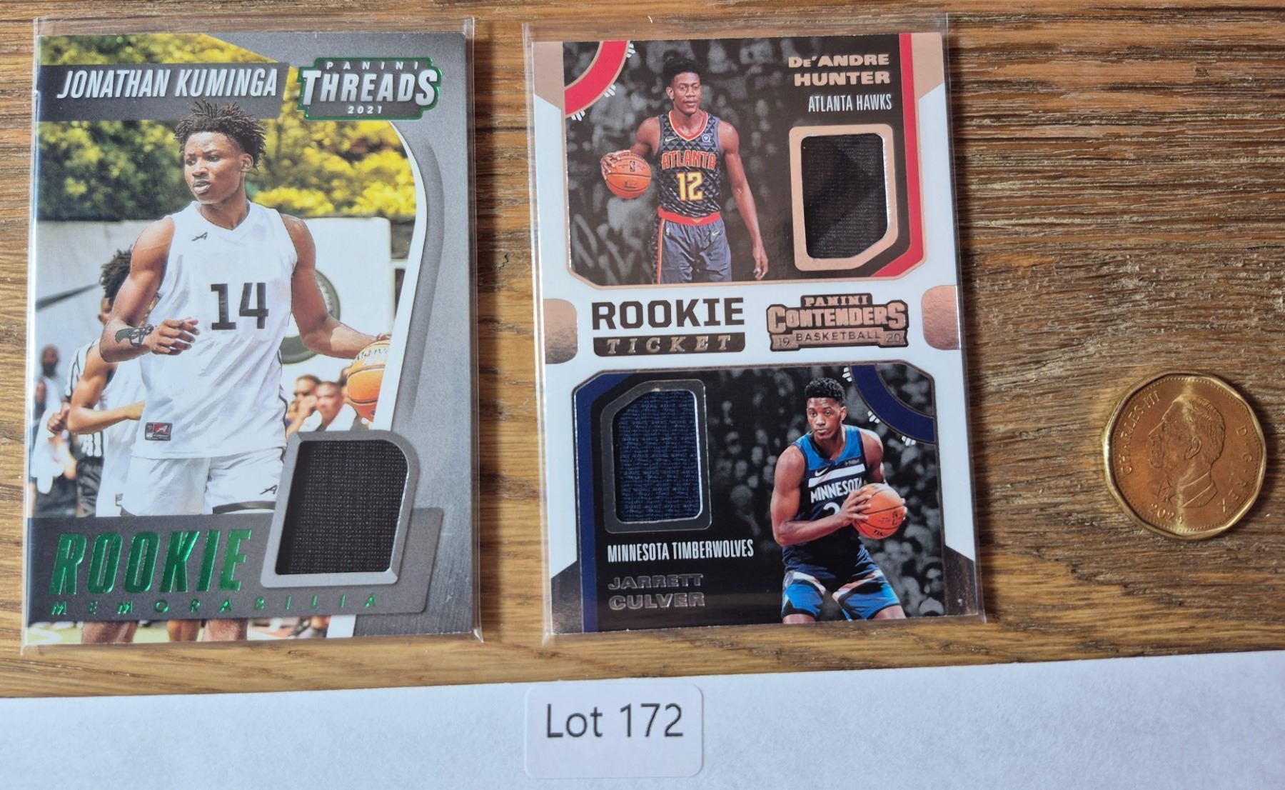 Jonathan Kuminga 2021 Panini Threads Rookie Memorabilia plus 2019-20 Panini Contenders Dual Rookie Ticket featuring De’Andre Hunter and Jarrett Culver (jersey swatches).