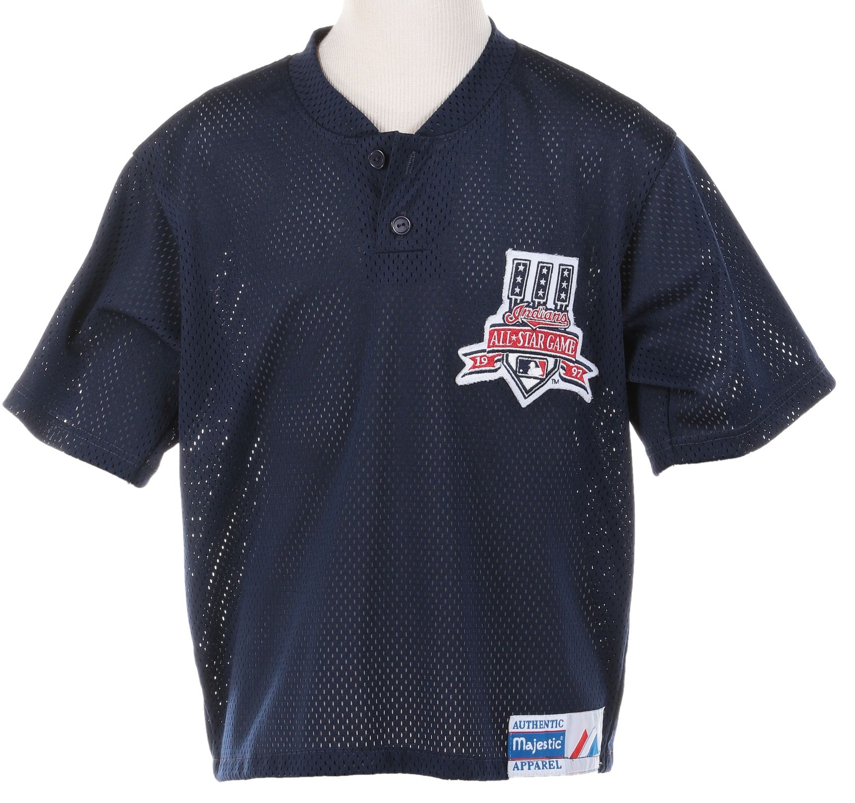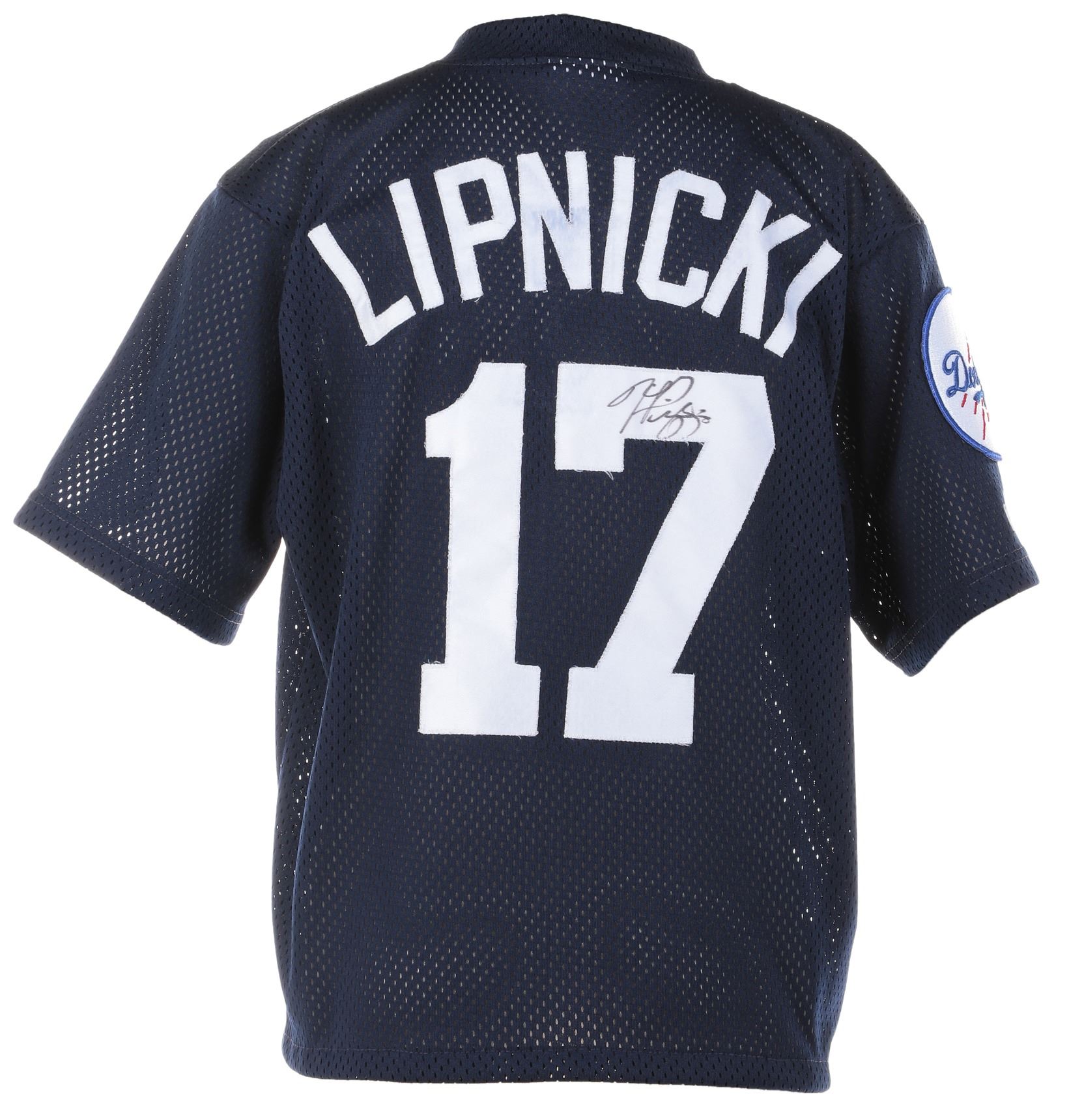 520. Jonathan Lipnicki's 1997 Celebrity All-Star game-worn Cleveland jersey signed by Mike Piazza.(1997) Original navy blue mesh short sleeve jersey with 2-buttons at neck, embroidered applique "Indians All-Star Game 1997" patch on left chest, "Dodgers" patch on right arm, and white satin applique "Lipnicki 17" on back, signed "Mike Piazza" in black ink. In fine condition. Comes with an LOA from Jonathan Lipnicki. $600 - $800