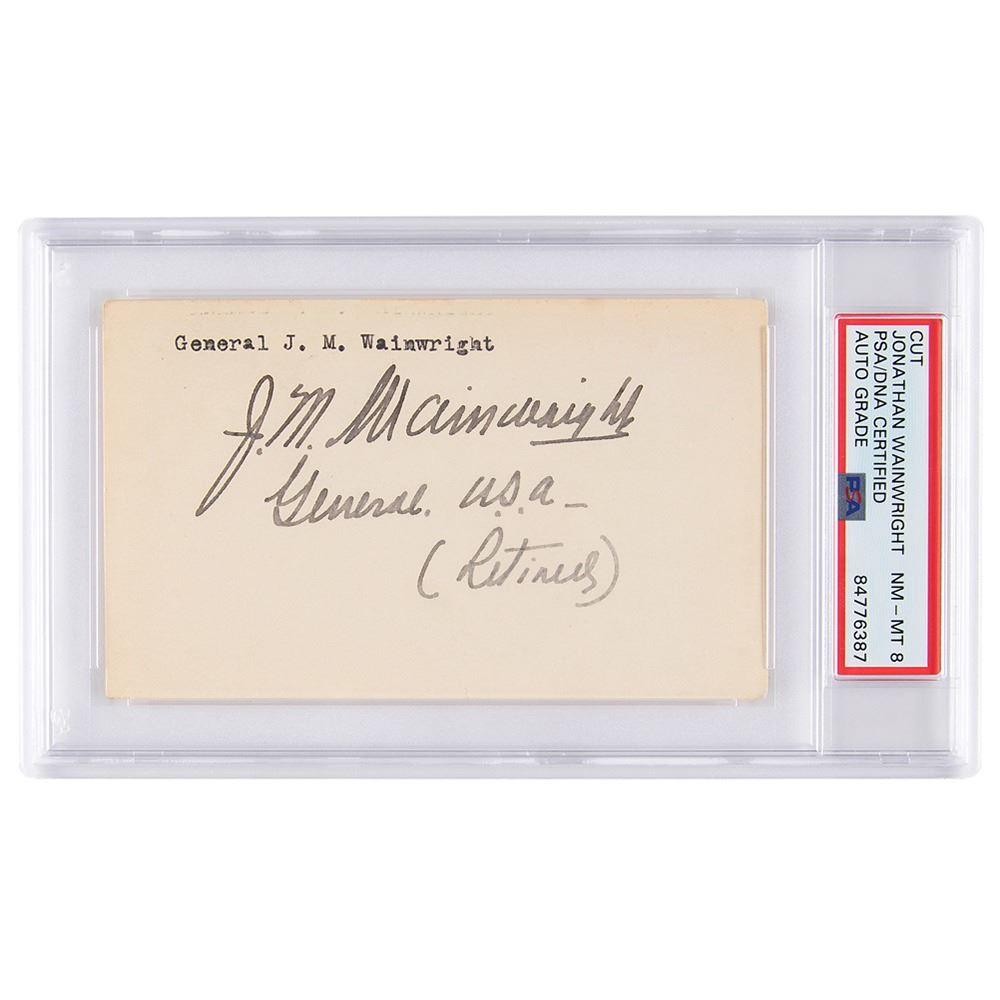 Vintage fountain pen signature of Jonathan M. Wainwright, "J. M. Wainwright, General, U.S.A.-(Retired),& rdquo; on an off-white 5 x 3 card. In fine condition. Encapsulated and graded by PSA/DNA as "NM-MT 8."