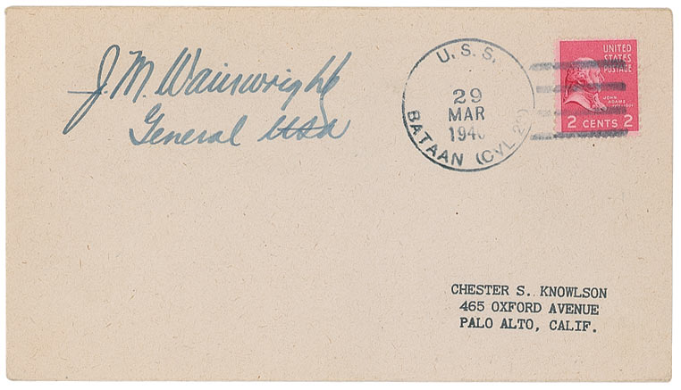 Postal cover signed in fountain pen, “J. M. Wainwright, General USA.” The envelope is postmarked March 29, 1946, onboard the USS Bataan. In fine condition, with uniform toning.