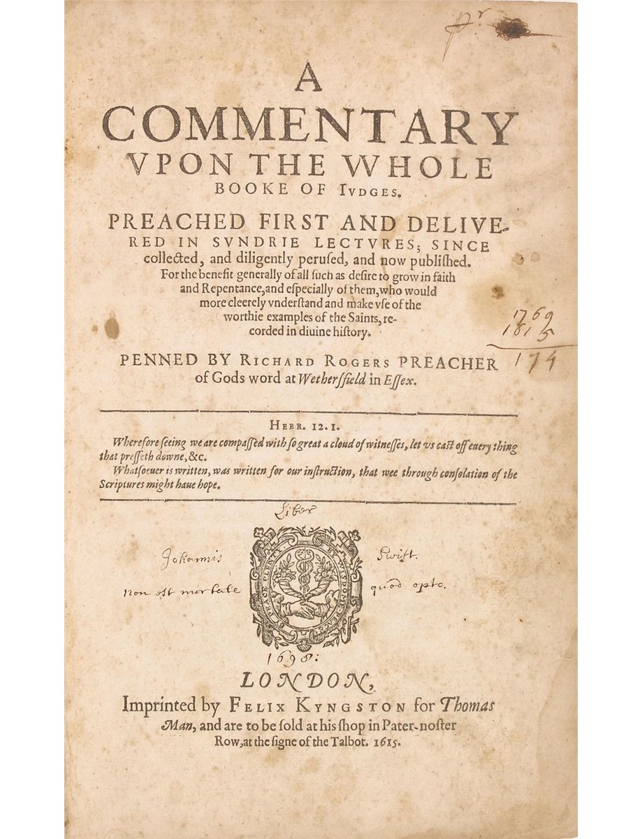 For his part, the famed Puritan writer Jonathan Swift was both a historian who recorded the trials and tribulations of the 17th century, and a type of soothsayer who looked forward to comment on the problems that plague the 20th century. His various works, including Gulliver’s Travels, satirized Puritanism, but his works also focused on the centuries old problem of alienation. An ordained Anglican priest, Swift was known to fervently defend the Church of Ireland, while his works would later attack not only Puritans, but any religion he felt was in decline or led by men participating in ‘evil’ practices. To think—this copy of A Commentary Upon the Whole Booke of Judges was once part of Swift’s personal library, likely used as inspiration, or perhaps as a target of satire, by one the greatest writers of the Enlightenment Movement.