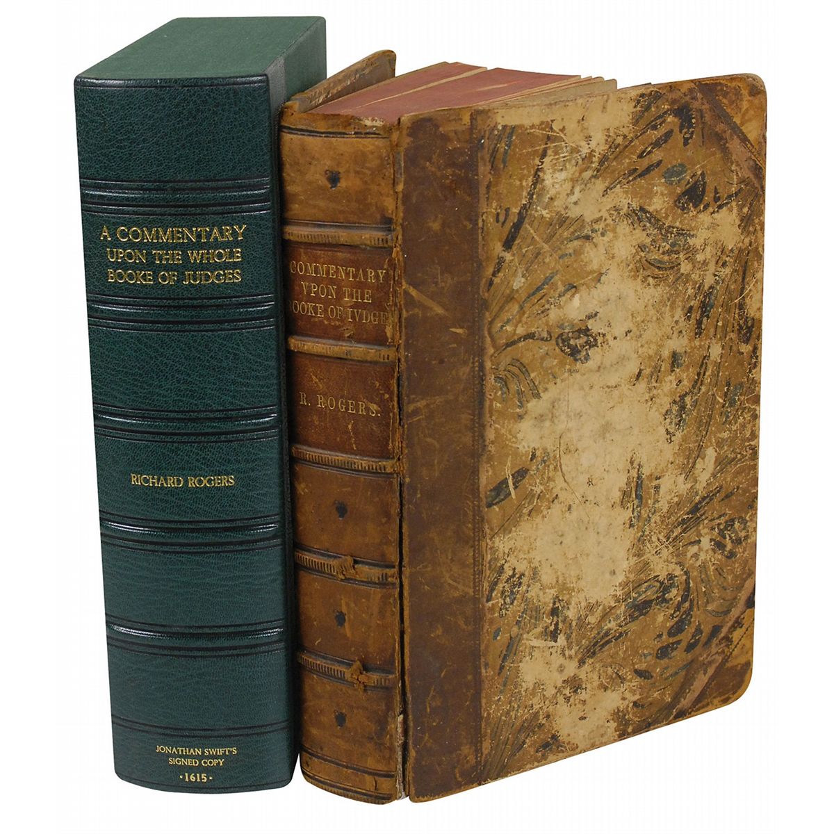 Signed book: A Commentary Upon the Whole Booke of Judges. Preached First and Delivered in Sundrie Lectures. London: Imprinted by Felix Kyngston for Thomas Mann, 1615. Contemporary replacement hardcover, 7.25 x 11, 970 pages. Signed in ink on the title page, “Liber Johannis Swift non est mortale quod opto 1698” [translated: What I desire is not mortal]. Book also bears a presentation inscription on the second free end page, preceding the title page, “S. R. Mason. Presented by Dr. A. C. Webber January 1856. Cambridge, Mass.” Autographic condition: very good, with scattered moderate toning and foxing to signed page, not affecting the crispness or legibility of the signature, and a few ink notations. Book condition: G+/None. Half-bound in brown leather and marbled paper, with gilt titles and five raised bands on spine; edges heavily worn, with boards exposed in several places; exterior heavily rubbed and scuffed (with harsher scuffs to two of the raised bands); front cover has been neatly reattached; foxing and mild soiling throughout. Despite its exterior cosmetic flaws and repaired hinge, the book is exceptionally nice considering its age. In a beautiful custom-made green leather and cloth slipcase, in NF condition with minor soiling.